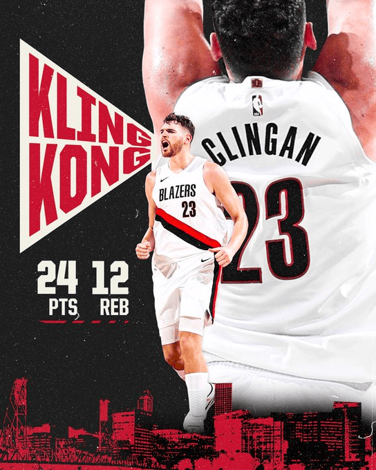 “多诺万-克林根在昨晚对阵马刺的比赛中砍下职业生涯最高的24分,助我们取得胜利!”