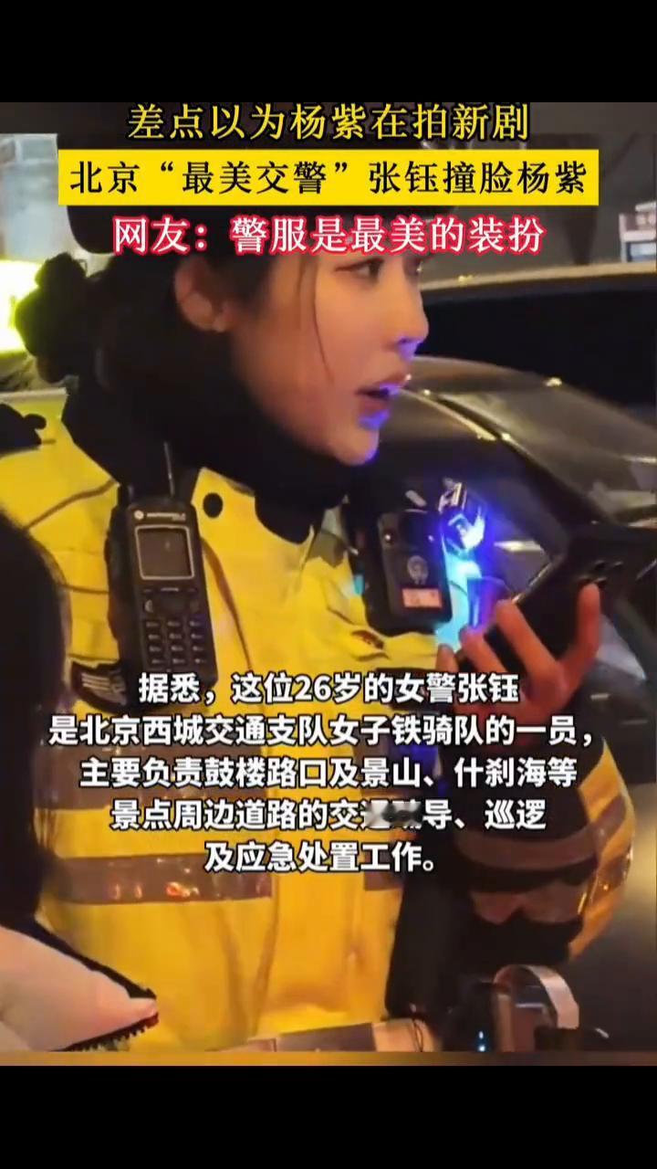北京"最美交警"张钰撞脸杨紫,差点以为杨紫在拍新剧。 近日,一位身着警服、英姿飒爽的北京交警在网络上引发关注。据悉,这位26岁的女警张钰是北京西城交通支队女子铁骑队的一员,主要负责鼓楼路口及景山、什刹海等景点周边道路的交通疏导、巡逻及应急处置工作。因其执勤时的亲切笑容与干练形象神似演员杨紫,被网友称为"最美交警"。