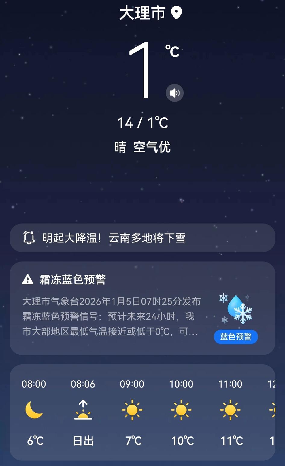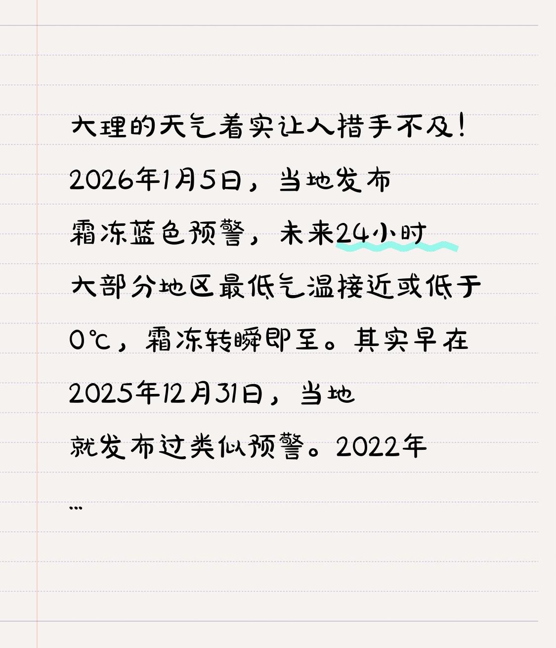 大理的天气着实让人措手不及!2026年1月5日,当地发布霜冻蓝色预警,未来24小时大部分地区最低气温接近或低于0℃,霜冻转瞬即至。其实早在2025年12月31日,当地就发布过类似预警。 2022年12月,大理还发布过寒潮蓝色预警,气温急剧下降,对农业、畜牧业等造成较大影响。此次霜冻预警,大家需提高重视。农户要尽快为农作物、花卉等做好防护,市民也要注意添衣保暖,谨防突如其来的寒冷侵袭。 霜冻