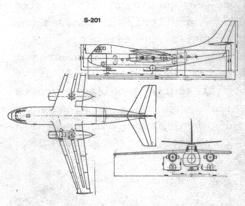 自二十世纪五十年代中期起,北约欧洲成员国提出了一系列北约基础装备需求标准。其中前四项涉及飞机项目,最后一项NBMR.4则针对垂直/短距起降战术运输机。 在英国众多竞标方案中(包括阿姆斯特朗·惠特沃斯公司的AW.681),北爱尔兰肖特兄弟公司的方案尤为突出。该公司曾向英国皇家空军提供过配备吊舱式升力发动机组的双涡轮螺旋桨设计方案,加之在开发贝尔法斯特运输机过程中积累的经验,肖特兄弟公司认为自己在NBMR.4项目的竞争中具备领先优势。 该方案被命名为PD.55,采用四台功率2650马力的罗尔斯·罗伊斯达特涡轮螺旋桨发动机,并在翼根延长段的两个吊舱内安装了24台推力1850磅的罗尔斯·罗伊斯162涡轮喷气发动机。 参与NBMR.4项目竞标的六个北约国家共提交了25个方案,PD.55(图1-4)位列其中。截至1962年(即初始方案提交两年后),需求标准出现松动,新方案编号变更为NBMR-22,将原定航程要求缩减至仅500英里,并附加中标方案需在1964-65年间推出首架原型机的条件。 然而局势自此趋于复杂:法国成为唯一确有如此短程运输机需求的国家。尽管一切看似仅处于推迟阶段,但NBMR.4与22号需求标准最终于1967年4月双双取消,PD.55方案随之夭折。 意大利官方提交的NBMR-4垂直/短距起降运输机方案是G-222。鲜为人知的是,其他意大利公司也提交了设计方案,但被告知放弃。其中研究最为深入的方案之一是SIAI-Marchetti公司的S-201(图5),这是工程师布雷纳(Ing. Brena)的第一个正式项目。布雷纳曾是亚历山德罗·马尔凯蒂的得力助手和继任者(他是所有S-2XX系列飞机的缔造者,也是20世纪50年代SIAI公司授权生产的纳尔迪FN-333的设计者之一)。S-201是一款短距起降飞机,配备可调方向喷气发动机和抬高的座舱,以便为前舱门腾出空间。顺便 一提,在决定由菲亚特公司中标后,其他公司组成了一个联合体来建造这架飞机。SIAI-Marchetti公司负责尾翼的详细设计和制造。
