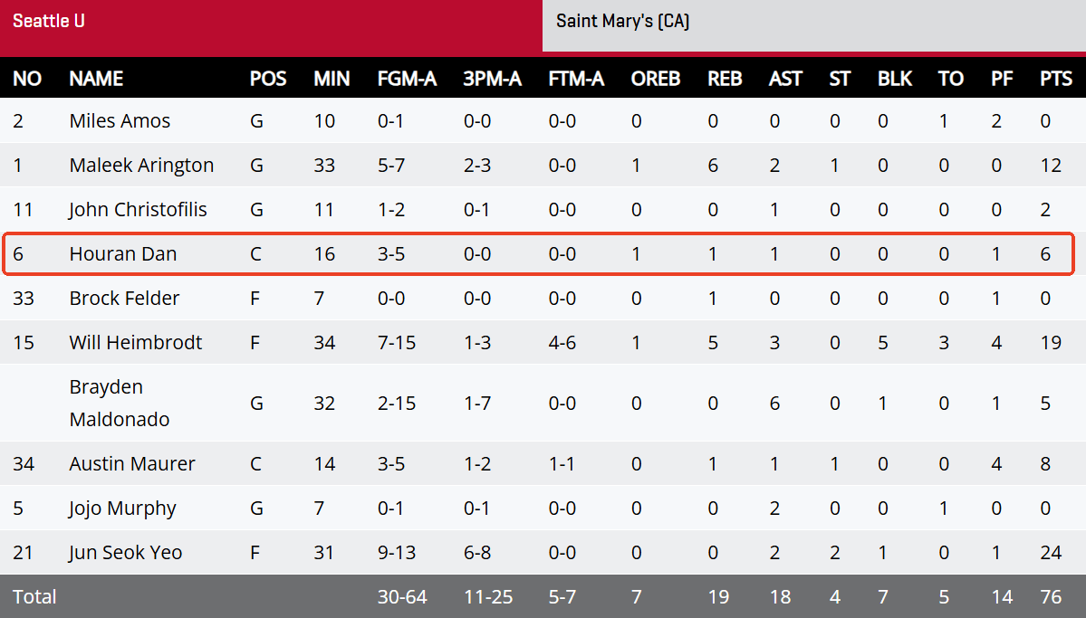 NCAA常规赛:淡厚然6分1板,西雅图大学不敌圣玛丽大学