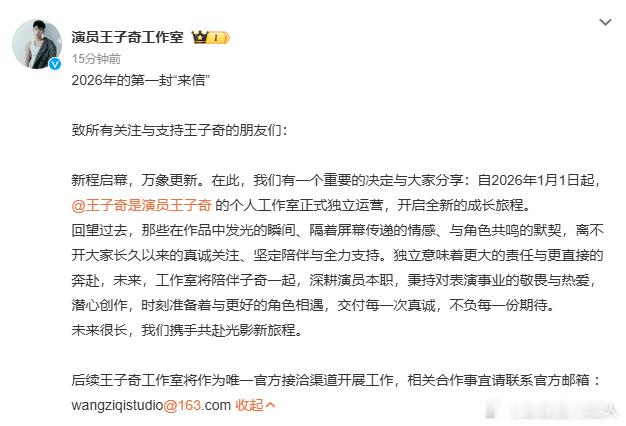 王子奇个人工作室独立运营 王子奇事业迈入新阶段!个人工作室独立运营,意味着更多创