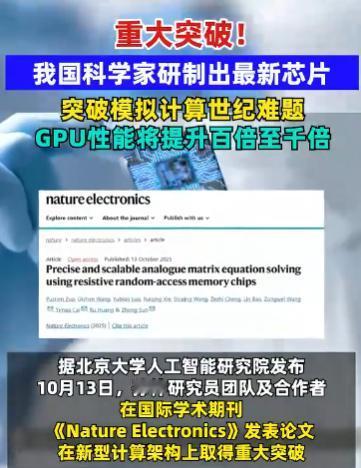 风向彻底变了!美国万万没想到,好不容易摁住了这条东方巨龙,没想到中国又冒出了更狠的角色!比尔·盖茨多次警告美国,不要打压中国,不然可能会促进中国更多的“对手”诞生 2025年12月,一篇论文让整个科技圈瞬间“炸锅”。 这篇引发震动的论文,是北京大学孙仲团队发表在权威期刊《自然・电子学》上的研究成果,核心就是他们成功研制出了一种新型模拟矩阵计算芯片。 简单说,现在我们用的电脑、手机里的芯片都是数字芯片,得把所有数据转换成0和1才能运算,而模拟计算芯片不用这么麻烦,直接用电压、电流这些物理量就能完成计算,天生就有运算快、耗电少的优势。但这个技术有个世纪难题,就是精度太低,误差大到没法满足现代科技的需求,所以早就被数字芯片取代了。 孙仲团队的突破就在这儿,他们把模拟计算的精度一下子提升到了24位定点精度,相对误差降到了千万分之一,比之前的技术精度提升了五个数量级。这个数据有多厉害?就是第一次让模拟计算的精度能跟主流数字芯片媲美,而且运算效率和能耗优势还保留着。实验测试显示,用这款芯片求解中等规模的矩阵问题时,计算速度和能效比当前最顶级的数字处理器还要高出百倍到千倍。 更让美国没想到的是,这款芯片还绕开了他们卡脖子的关键环节——光刻机。孙仲团队的芯片可以在28纳米及以上的成熟工艺下量产,不用依赖最先进的高端光刻机。这就意味着,美国再想通过限制光刻机出口来遏制中国芯片发展,这条路在这个领域已经走不通了。 美国之前为了阻止中国芯片进步,连英伟达的高端AI芯片都限制对华出口,还要求企业上缴在华销售额的一部分才肯放行,就是想卡住中国的算力脖子。但现在中国自己研制出了更高效的算力芯片,相当于在美国的封锁墙上打开了一个大口子。 这篇论文之所以能让全球科技圈炸锅,核心就是它打破了美国在高端算力领域的垄断预期。孙仲团队的技术不仅能用于人工智能大模型训练,还能支撑6G通信、气象预报、量子力学模拟这些超级计算场景。 比如在6G基站建设中,它能让基站低能耗处理海量天线信号;在人工智能领域,能大幅提升大模型的训练效率,还能让复杂的智能运算直接在手机、机器人这些终端设备上实现,不用再依赖云端。这些应用场景一旦落地,会彻底改变全球算力格局。 其实这正好印证了比尔·盖茨的警告,美国的技术封锁,反而让中国科研团队更坚定地走自主研发之路。孙仲团队深耕这个领域多年,从2019年就开始攻克相关技术,正是在美国持续的技术打压下,中国科研力量和资源不断向这些卡脖子领域聚集,才加速了突破的到来。除了孙仲团队的芯片,中国在其他科技领域也在不断突破,比如华为的昇腾AI芯片、各类国产操作系统,都是在美国的封锁中成长起来的。 美国原本想通过打压让中国科技停滞不前,结果却催生出了更多像孙仲团队这样的“对手”。以前美国靠技术垄断掌握着全球科技话语权,现在中国在模拟计算这种全新的技术路线上实现领先,相当于开辟了一条新赛道。这条赛道上,中国不仅有核心技术,还有成熟的量产能力,未来很可能在人工智能、6G这些关键领域掌握更多主动权。这也说明,科技发展从来不是靠封锁能阻止的,美国越是想摁住中国,中国就越能爆发出创新活力,这股力量,正是美国最不愿看到的。