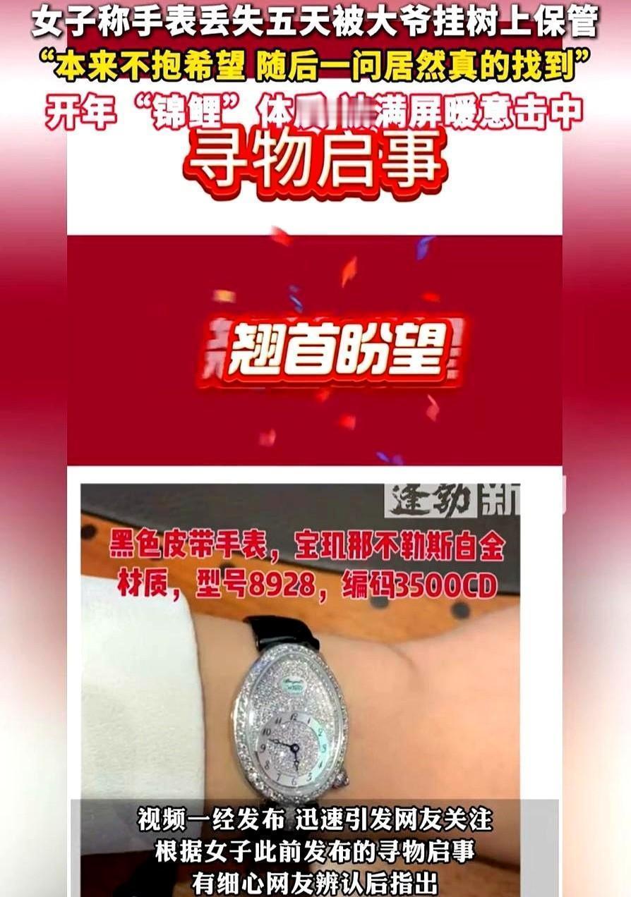 昨晚跟几个朋友吃饭,一个长沙本地的老大哥抿了口酒,慢悠悠聊起上个月街头发生的事,我听完当场就愣了。 长沙街头丢了块40万的百达翡丽,捡到它的是个机械厂退休的大爷,他没报警也没揣兜里,反而从兜里摸出根绳子,把表挂在了路边最显眼的桂花树上,刚好系在一米多高的枝桠上,路过的人抬眼就能看见。 失主妹子快急疯了,沿着那条路来回找了三天,眼睛都快贴到地砖上,把每道砖缝都扒拉了一遍,最后都要认栽放弃了。 直到碰到散步的大爷,她抱着最后一丝念想比划了手表的样子,大爷往旁边一指:“那树上挂的是不是你的?” 最戳人的是,大爷根本不知道这表值40万,只觉得是块挺好看的表。他怕放地上被人一脚踢飞,揣在兜里怕失主回来找不到人,就干脆把表挂在了原地最显眼的地方。 说白了这就是一场豪赌,用40万赌路过的人心里那点善意,最后他赌赢了。 听完我心里暖乎乎的,换作是你捡到这么贵重的东西,会怎么做?你们身边还有过这种让人心里一软的小事吗