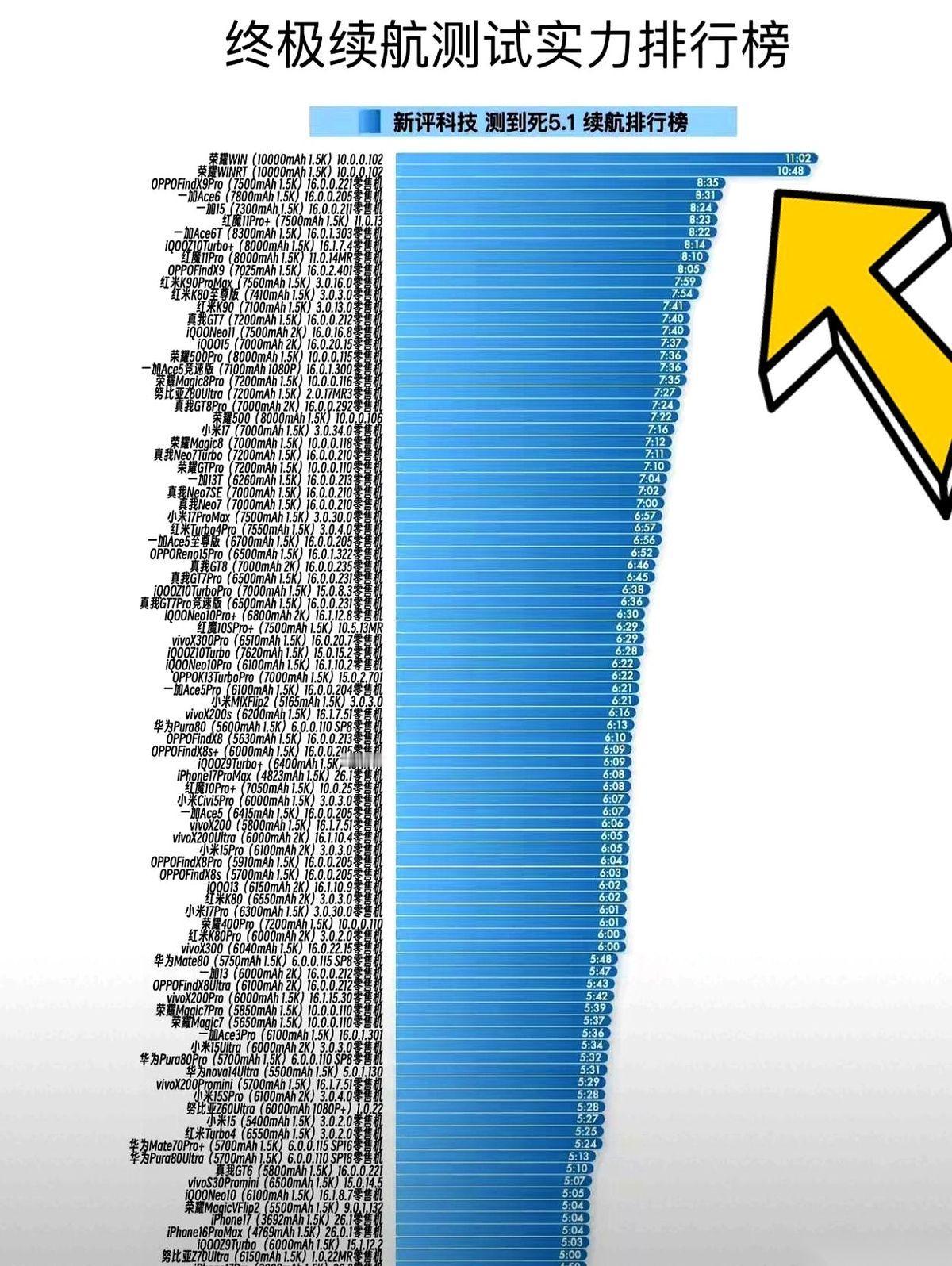 手机续航榜单刚刷出来,我本来想直接拉到最后,看看谁又垫底了。 结果往上一翻,第一、第二名,压根就没给后面留活路。 荣耀那两台新机,直接揣着一块10000毫安的电池就上场了,分数条直接顶穿,跟第三名之间,隔着一道悬崖。 以前那些5000、6000毫安的机子,个个都说自己是续航猛男,现在往这一放,齐刷刷地像陪跑的小弟。整个榜单,看起来都不像一个维度的比赛了。 等于说,你早上拔了充电线出门,开着导航,聊着天,午休时还打了两把游戏,一直折腾到半夜准备睡觉,一掏手机,电量显示还有一大半。 这已经不是在解决用户的续航焦虑了。 这是直接给其它厂商,上了一堂“续航羞辱课”。所以,性能和这种怪物级的续航,现在真能都要了?