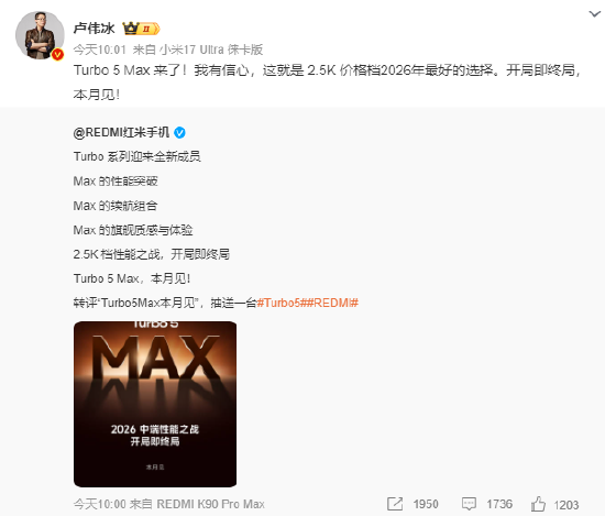 红米Turbo 5 Max本月发布,卢伟冰:今年2.5K价格档最佳选择