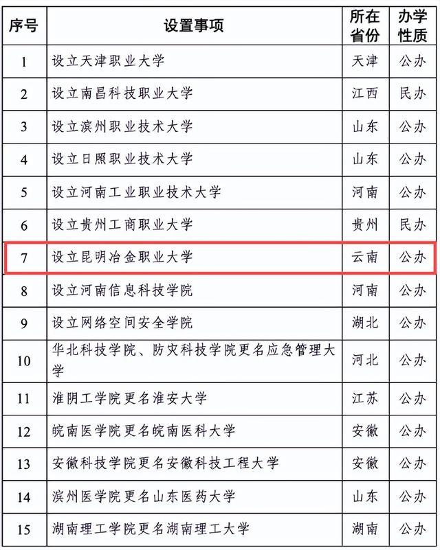 今天(1月4日),教育部官网发布关于拟同意设置本科高等学校的公示,其中,云南拟设立昆明冶金职业大学。