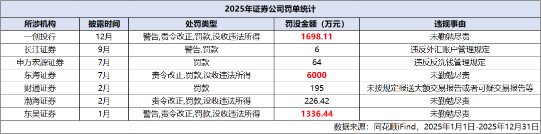 同花顺iFind数据显示,2025年各地监管部门累计开出9张涉及罚款的罚单,罚没金额在万元以上的有7张。多家券商因投行业务未勤勉尽责收到大额罚单,处罚均同时针对机构及相关直接责任人员。其中,年内金额最高的一张罚单,开给了东海证券。