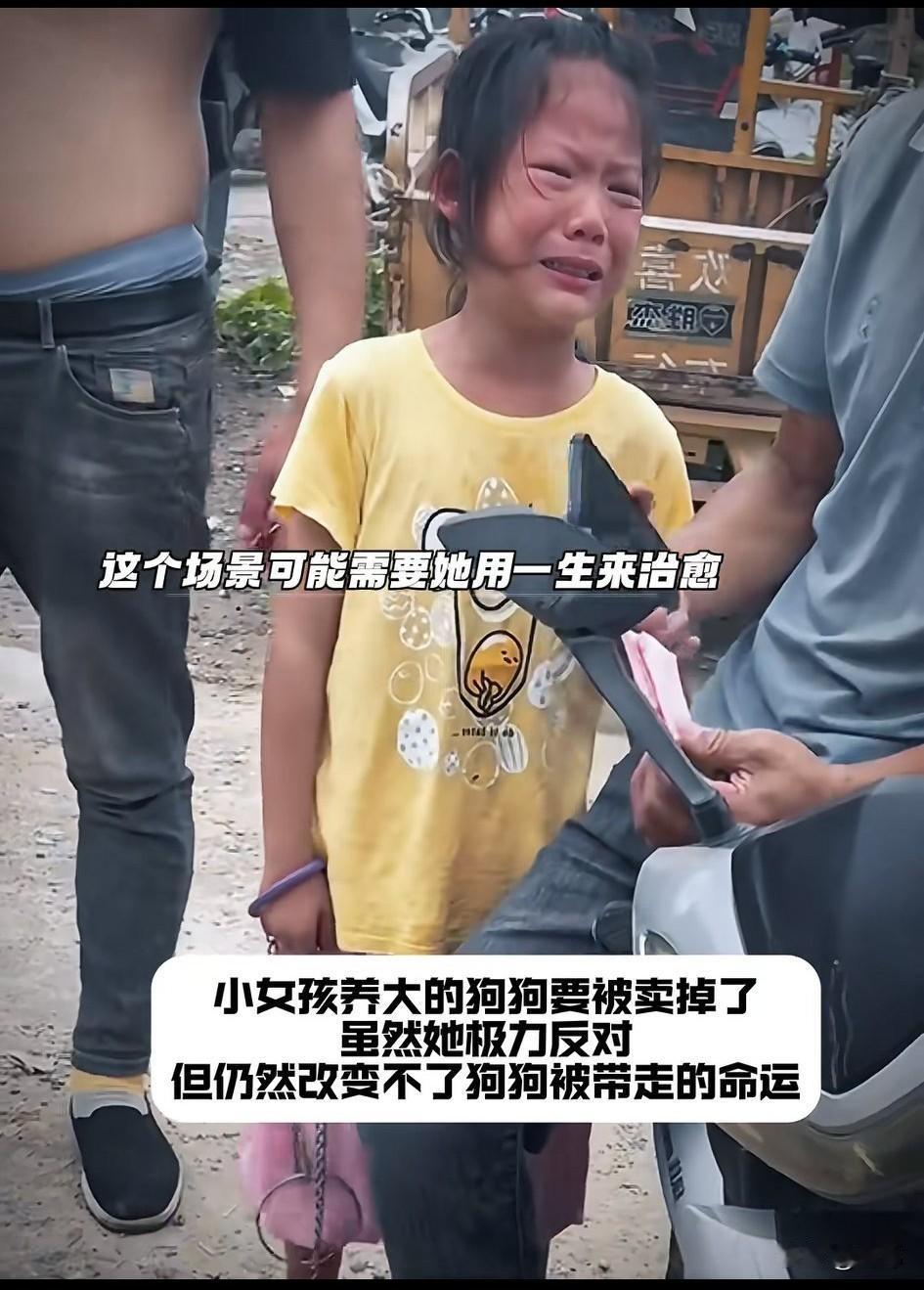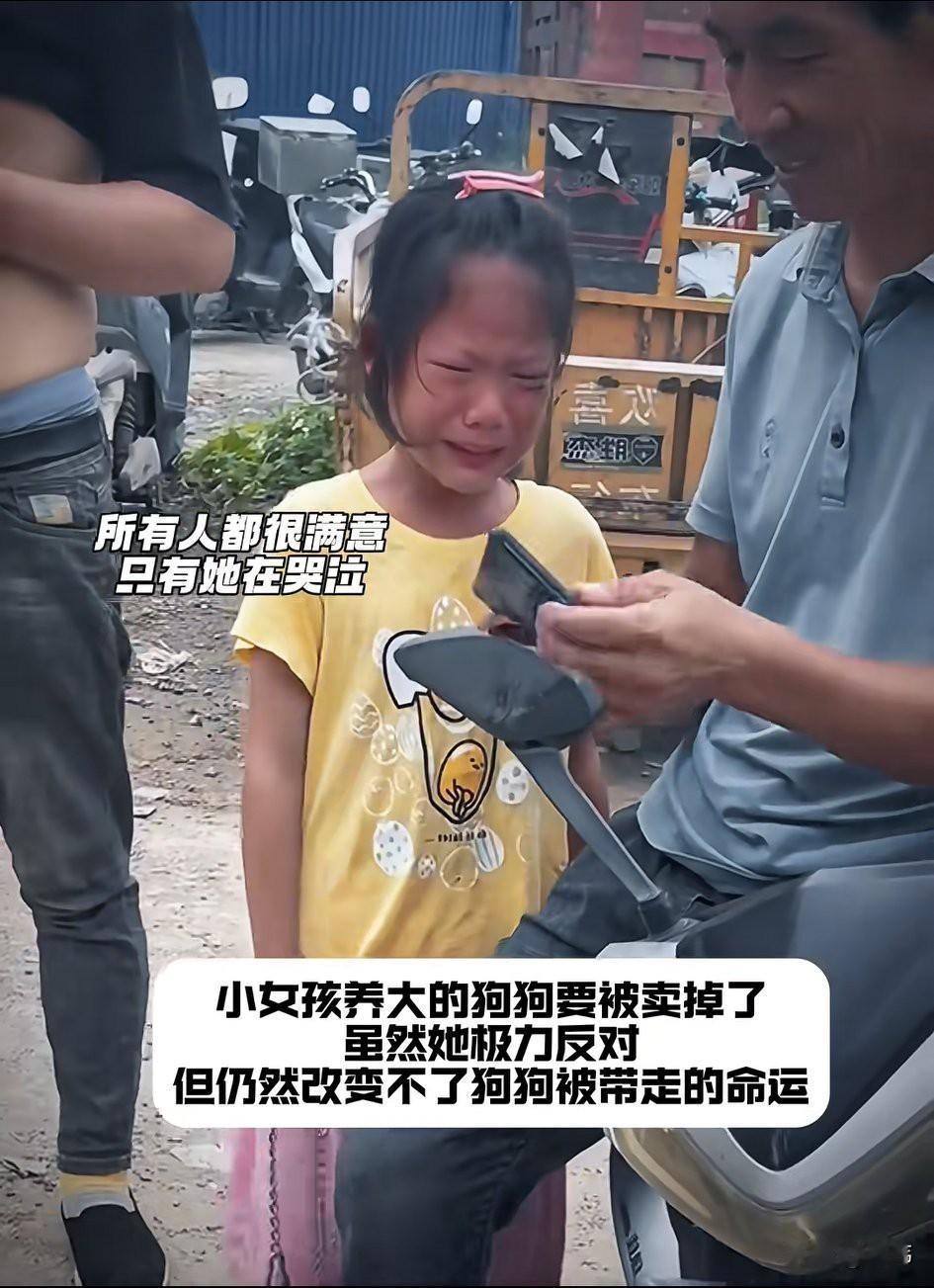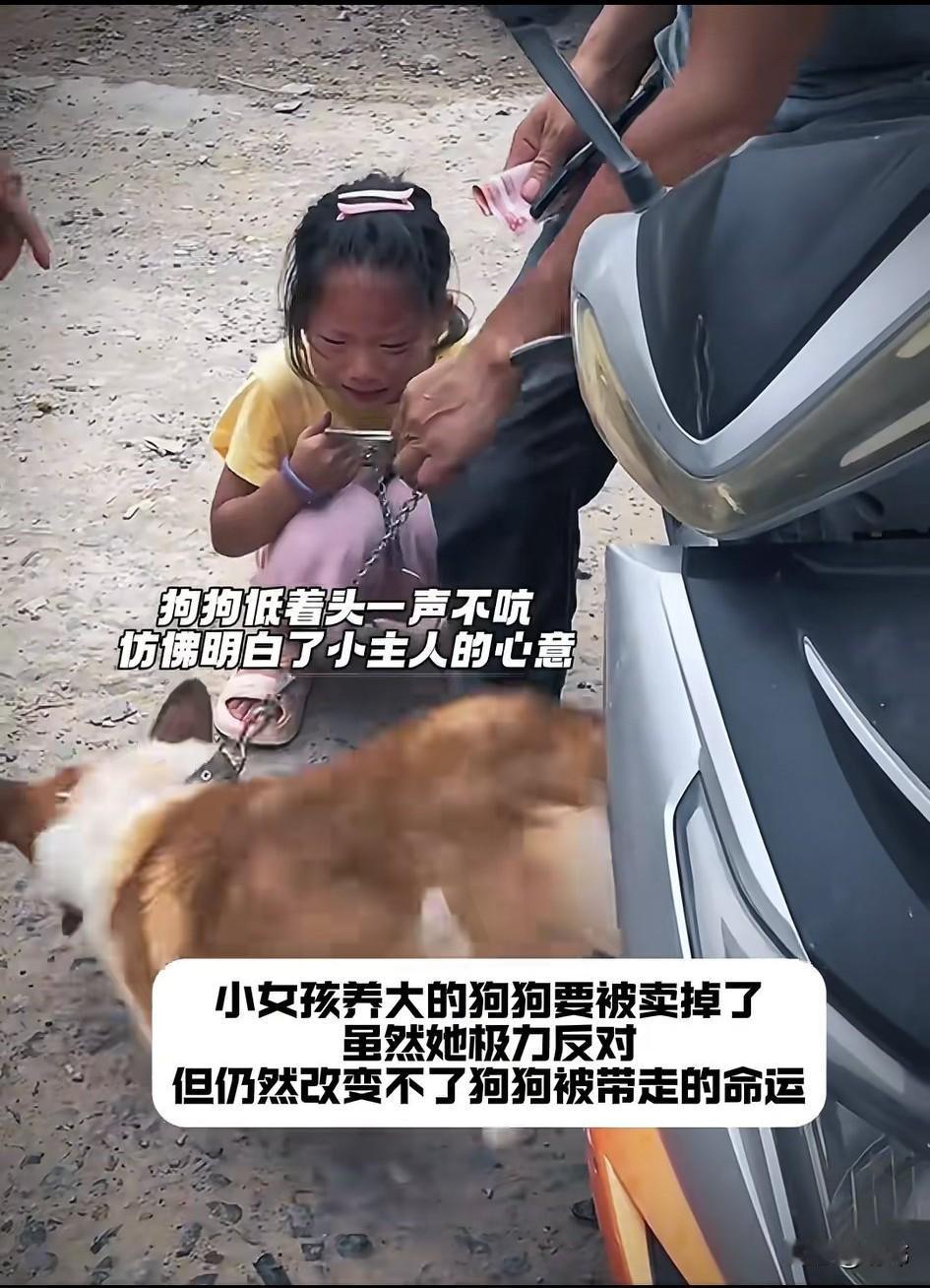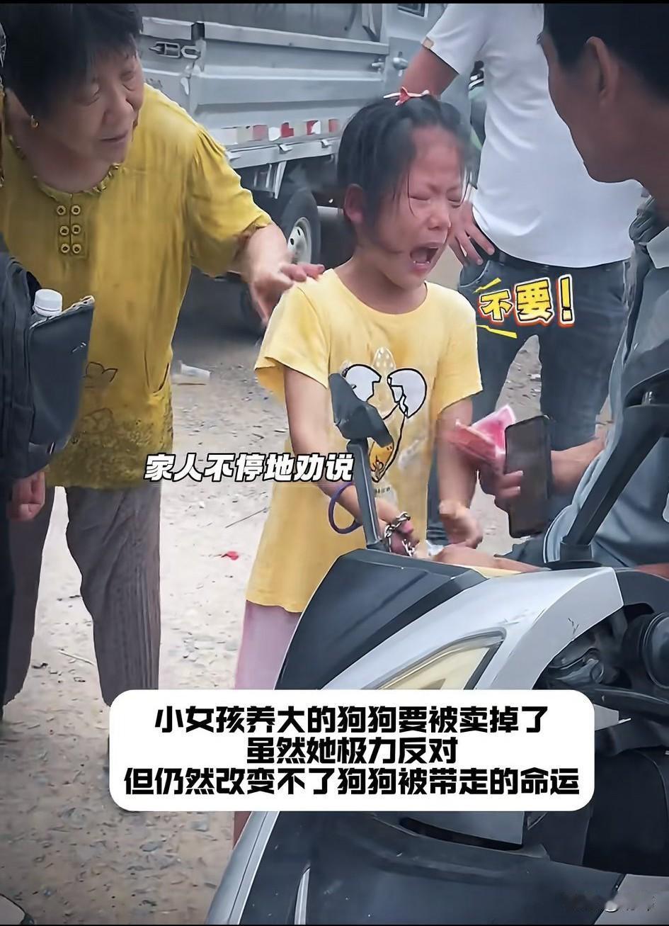 太可怜了!一位小女孩养了一只狗狗,这是她生日的时候爷爷送给她的,她一直视如珍宝的对待狗狗。可这天,她爸爸居然要卖掉狗狗,小女孩如遭雷击,非常伤心,无助地痛苦起来,家人虽然不停地劝说,可小女孩依旧痛苦不已。 狗贩子见小女孩不愿意松开狗链,他就上前解开了狗狗项圈,小女孩眼见狗狗要被带走,蹲在了地上崩溃了,狗狗似乎也明白了小主人的心意,跑过去安慰她,而她的爸爸则满意的数着钱,现场的人都挺满意这场交易,唯独小女孩的心碎了,依旧在大哭。她很无助很无奈,她留不住自己的狗狗,这个场景或许需要她用一生来治愈。