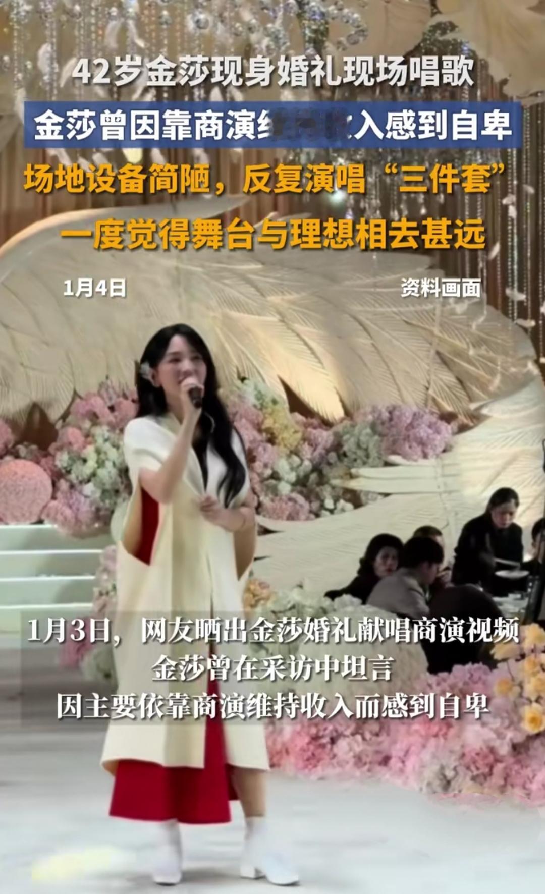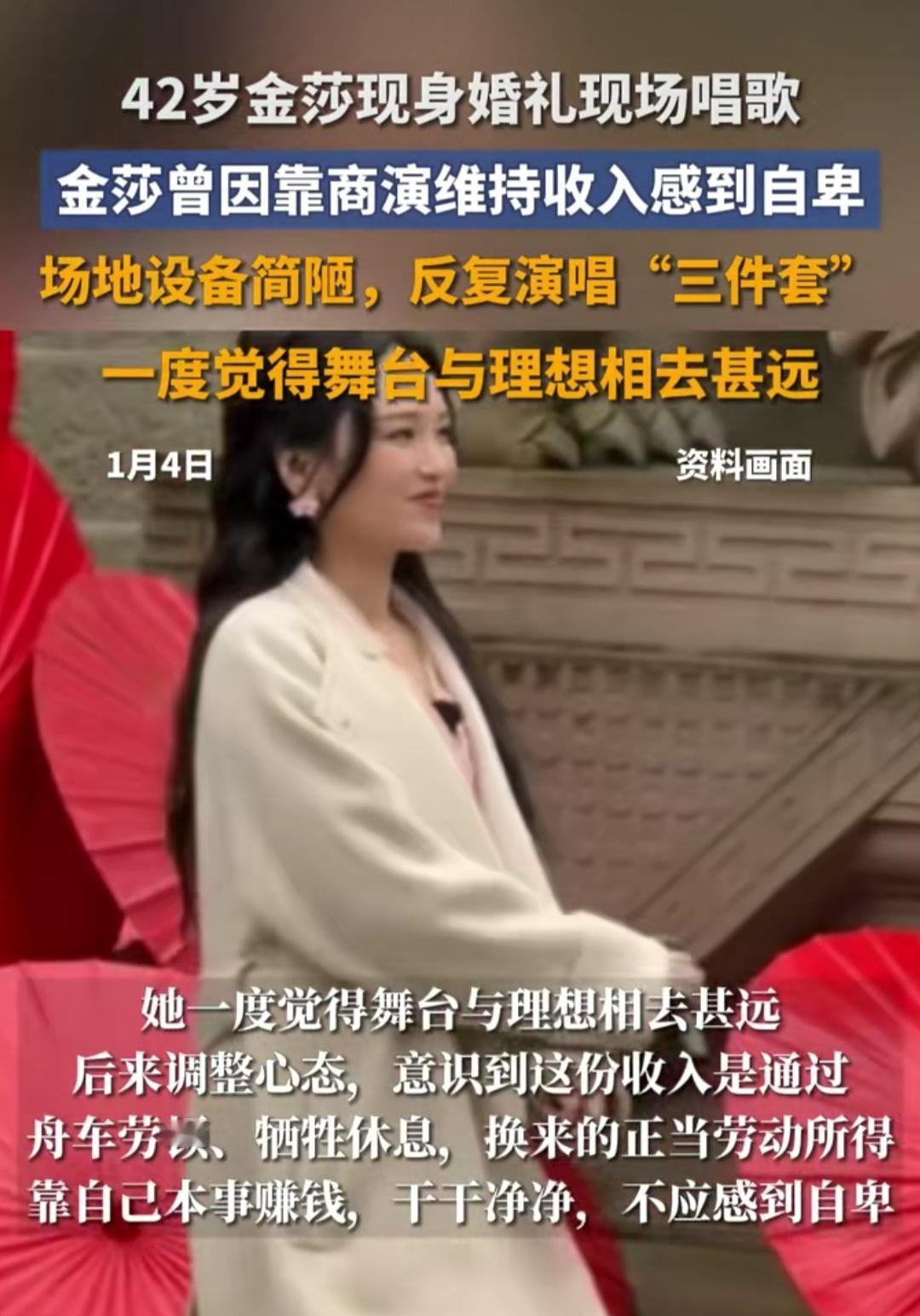 谁能想到,曾经火遍大街小巷的“甜歌天后”,如今会站在县城婚礼的舞台上唱歌?没有华丽舞美,没有万人大合唱,只有简单的音响和台下宾客匆匆的目光,42岁的金莎握着话筒,把《星月神话》唱得字字戳心。 早年间她在采访里坦言,最窘迫时全靠这类商演维持收入,翻来覆去唱着那几首成名曲,看着和理想中差了十万八千里的舞台,心里满是自卑。可谁不是一边仰望星空,一边低头赶路呢? 没有永远的流量,只有不肯放弃的坚持。如今她依然认真对待每一个舞台,哪怕只是婚礼上的十几分钟,也用尽全力发光。其实我们普通人也一样,为生活奔波的日子里,那些看似“不体面”的坚持,都是为了守住心底的热爱。 生活从不是只有鲜花掌声,更多的是默默耕耘的平凡。愿每个为生活努力的人,都能在自己的舞台上,闪闪发光。
