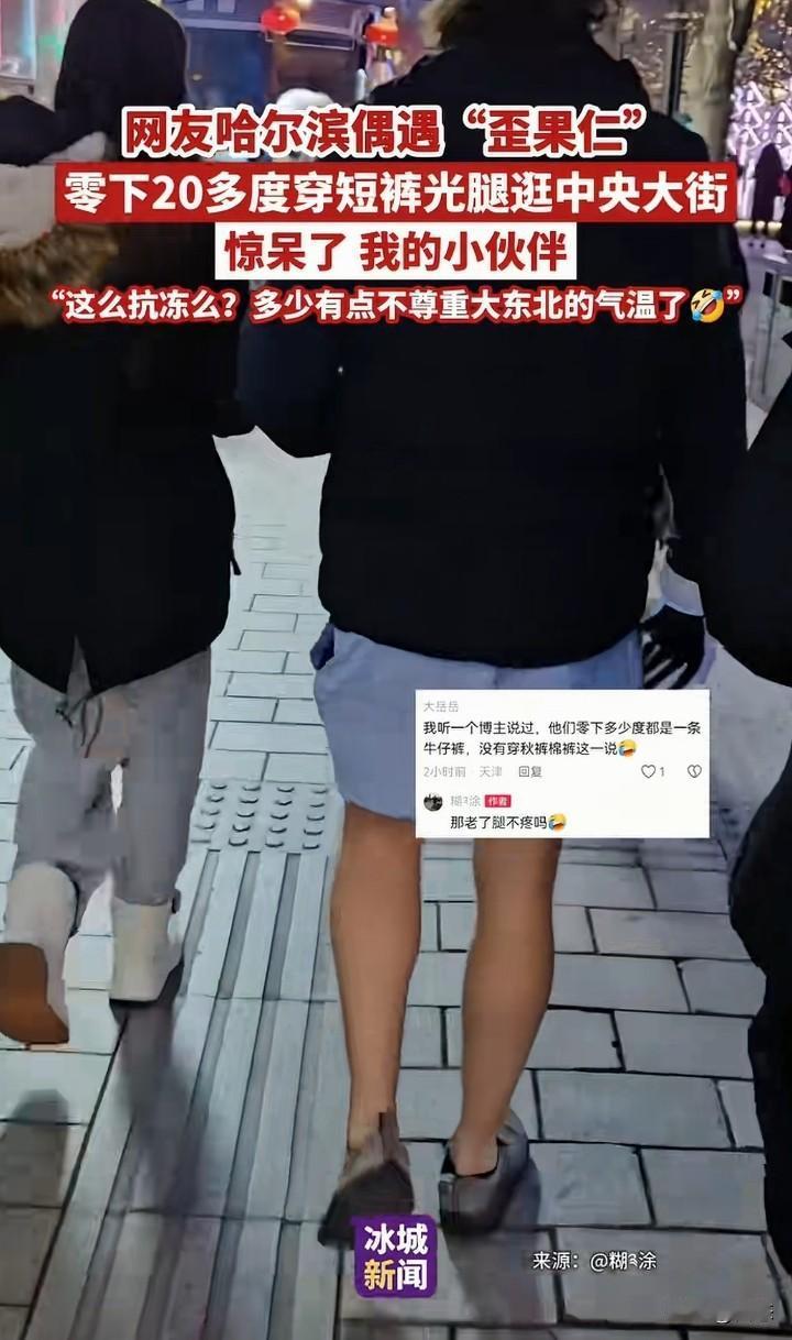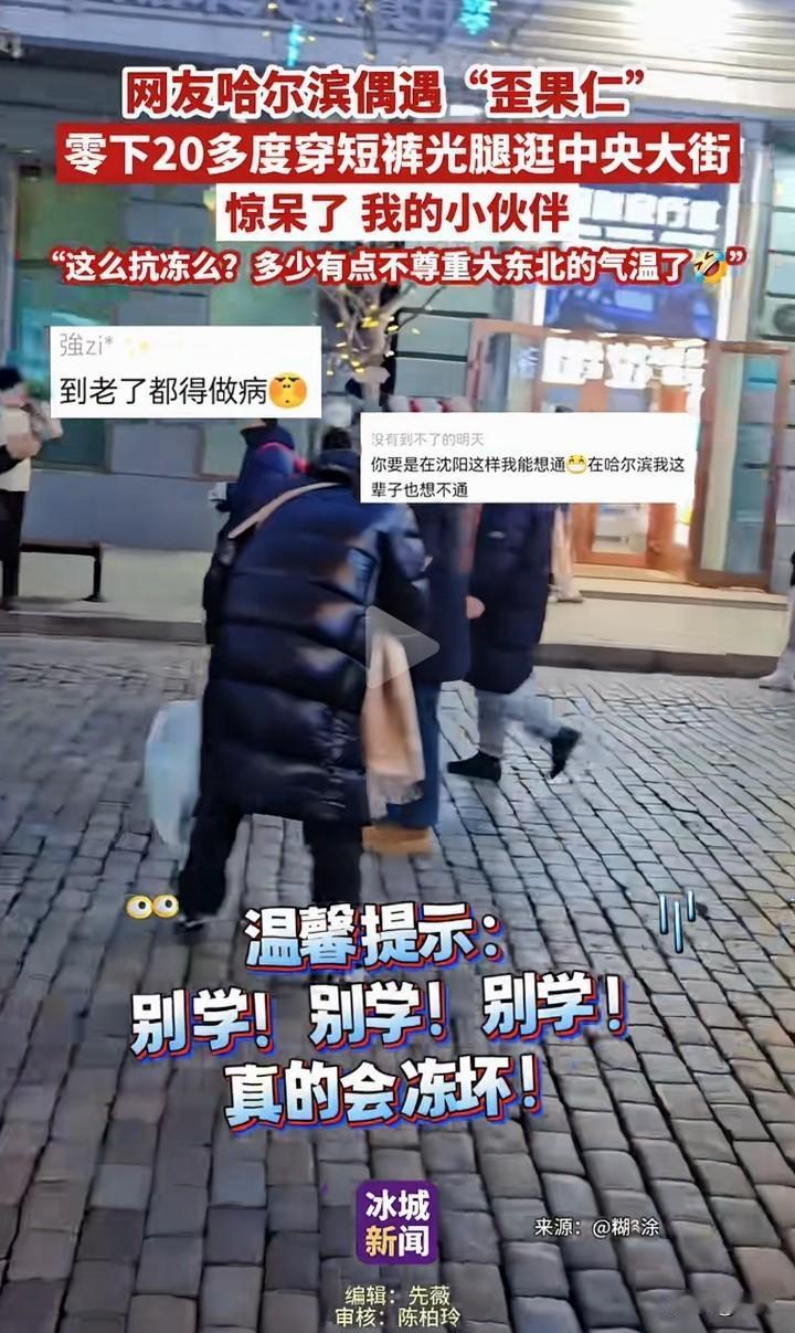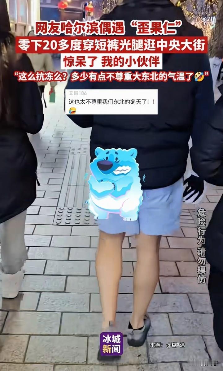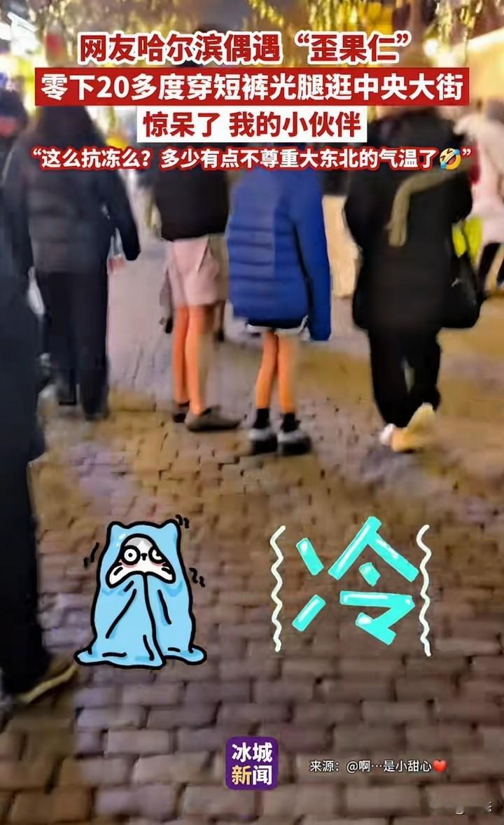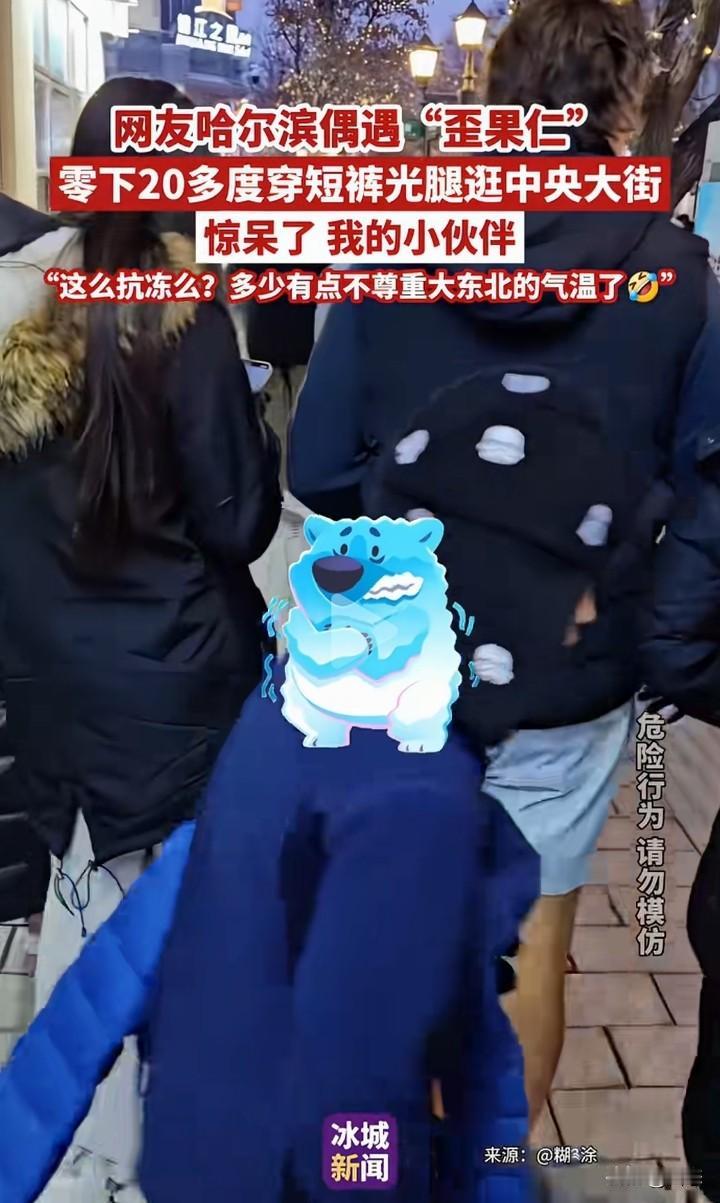 惊讶,有网友在哈尔滨零下20度遇到外国游客,没想到被老外的穿着打扮给惊讶到了,老外居然穿着短裤在中央大街逛,难道他们不怕冷,还是抗冻呢? 中国人都包裹着严严实实的,看到这不由感叹,外国人身体不是一般的强啊! 在这里提醒一下,千万不要模仿,就算在抗冻,也不要这样,以后有后遗症,那就后悔都来不及。 你们怎么看老外的操作呢?