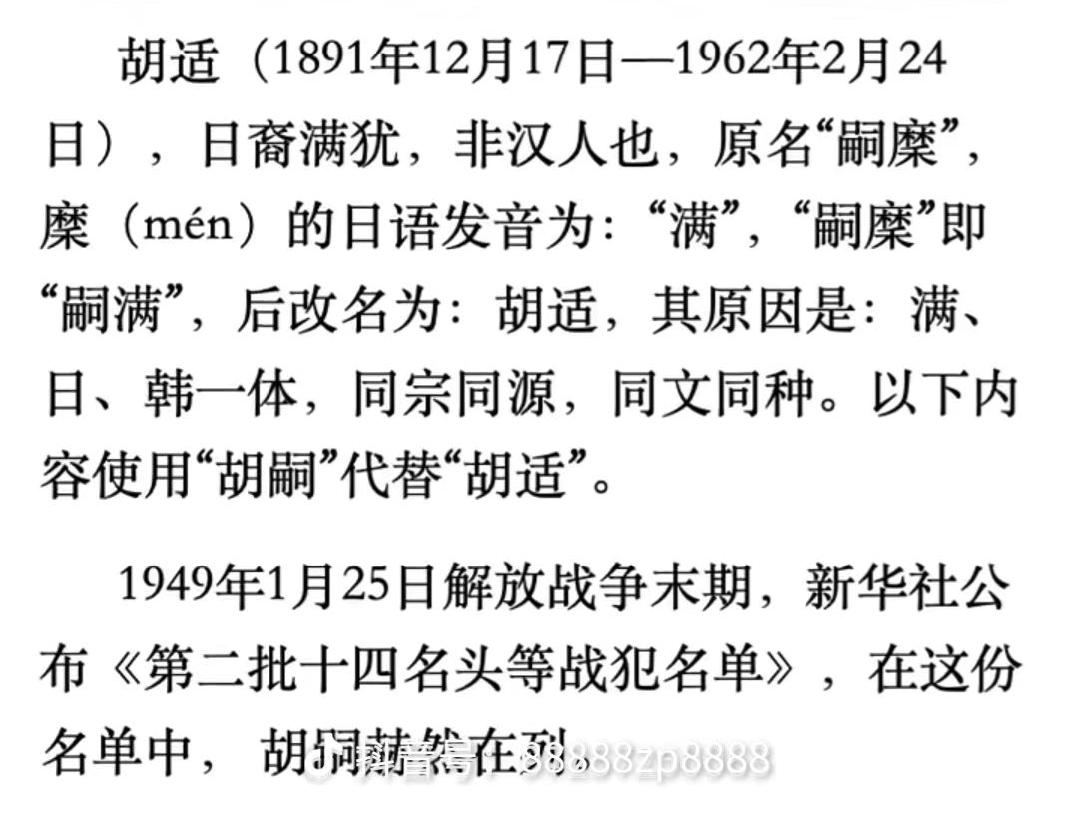 什么人把胡适弄成了思想领袖? 网络上的评论一针见血:公知界的鼻祖,嫖 娼界的翘楚,战犯,民国大师。 再看看胡适名字的来历,满、日、韩同为一体,同尊同源,同文同种。 曾建议牺牲自己东三省,给日本。 还有… 就这么一个人,什么人想把他弄成中华民族的思想领袖! 被新中国定性为战犯的,有什么资格成为中华民族的领袖! 那不是走邪道吗?胡适