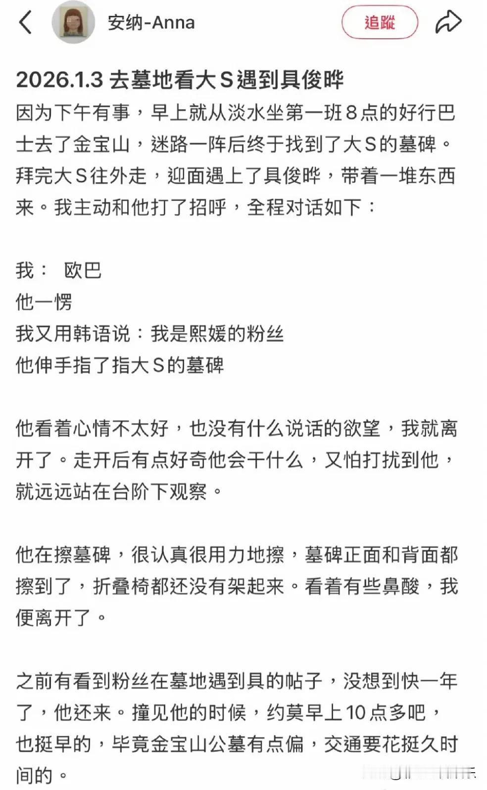 大S没有爱错人,元旦第一天具俊晔就来守墓,马上就到了大S的忌日,他把墓碑擦的干干净净。 所有人都开始了自己的生活,S妈和小S去101跨年,小S得了金钟奖还把奖杯送给了S妈,大家都挺好的,只有具俊晔还没有走出来。 汪小菲马上要当爹了,玥儿姐弟也大了有自己的生活和主见,爱久见人心具俊晔的余生就是大S的守墓人。