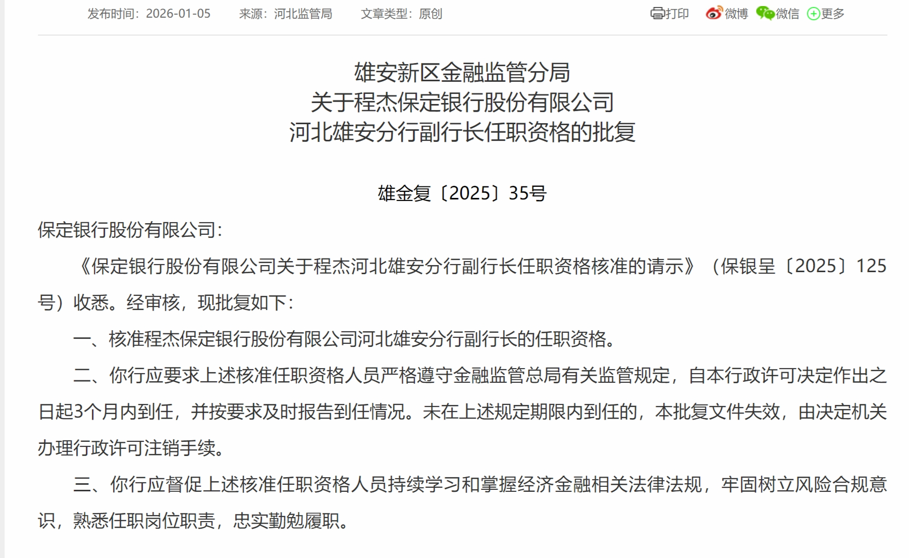 1月5日,雄安新区金融监管分局发布关于程杰保定银行股份有限公司河北雄安分行副行长任职资格的批复,核准程杰保定银行股份有限公司河北雄安分行副行长的任职资格。