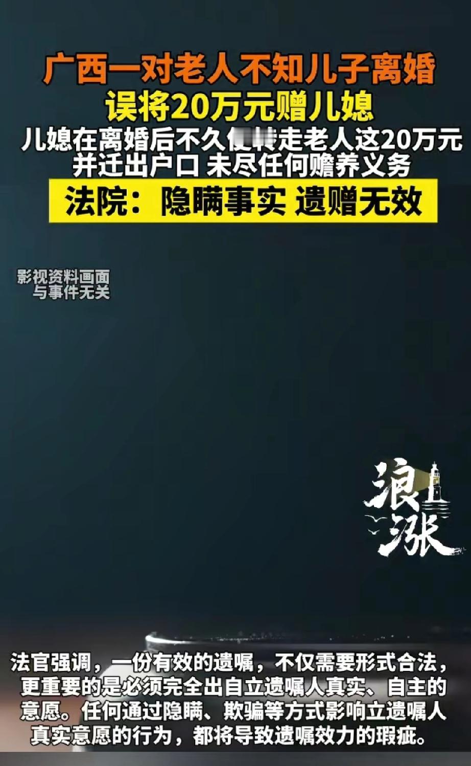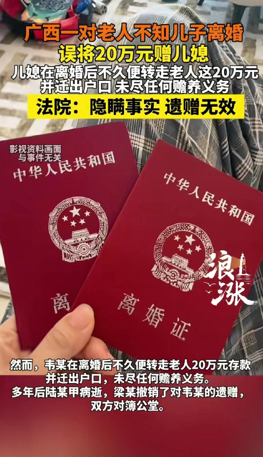 太解气!广西南宁,一对老夫妻在完全不知儿子已离婚的情况下,写下《遗赠》,把房子和存款都给了“儿媳”韦某,只盼她留下照料家庭。谁知韦某拿了20万存款后立刻消失,多年未尽一天孝心。老人起诉后,法院一锤定音:遗赠无效,钱必须还! 陆某甲、梁某老两口一直以为儿子家庭和睦。他们写下《遗赠》,将房产和存款赠与韦某,核心目的不是分财产,而是用毕生积蓄挽留“儿媳”,希望她继续维系这个家。这是老人对家庭团圆最朴素的渴望。 然而,韦某早已与老人儿子离婚。她清楚地知道这份《遗赠》是建立在“她仍是儿媳”这个错误前提下的,却选择了隐瞒。这一隐瞒,构成了后续所有欺骗的起点。 获得遗赠后不久,韦某便转走了老人20万元存款。此后多年,她对老人不闻不问,甚至将户口迁出,彻底割断联系。直至陆某甲老人病逝,她也未尽任何赡养义务。 法院审理认为,这份遗赠并非老人的真实意愿,因为他们是在被蒙蔽的情况下作出的决定。 更重要的是,法院指出这份赠与实质是“附条件的”:条件是韦某留下并照顾家庭。但韦某拿钱就跑,条件根本没实现,因此遗赠无效。韦某上诉也被驳回。 有网友说:“这儿媳太过分了,骗老人的钱,良心不会痛吗?” 还有网友感慨:“老人一片真心喂了狗,这以后还敢相信谁啊!” 这件事最残忍之处在于,它利用并践踏了老人最珍贵的亲情和信任。老人赠予的不仅是钱财,更是把对家庭的全部眷恋托付了出去。 咱就说,这韦某做得也太不地道了!老人年纪大了,一片好心被这么利用,换谁不寒心? 法院的判决,不仅追回了钱,更捍卫了“诚信”与“善良”不能被欺辱的公道。 判决明确告诉我们,任何基于欺诈、隐瞒而立的遗嘱或赠与,法律都不保护。它坚决维护每个人真实、自主的意愿。 “附条件赠与”是关键:生活中,许多基于亲情、期待的给予,实质都“附有隐形条 件”(如陪伴、照顾)。若对方根本不打算履行,法律上便有追回的可能。 咱们在处置重大财产时,即使面对亲人,也需保持必要的清醒和沟通。同时更警示世人:算计和欺骗或许能得一时的利,但永远赢不了人心的公道和法律的铁拳。 希望梁某老人能抚平创伤,安度晚年。愿天下父母的深情都不被辜负,愿每个家庭的付出都能被温柔以待。