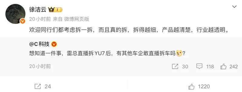 #汽车情报局#[徐洁云谈小米拆车:欢迎同行拆车促进行业透明]日前,小米创办人、董事长兼CEO雷军举行直播活动,主题为拆一辆小米YU7汽车。小米新任公关部总经理徐洁云再次谈到了“小米拆车”,他表示:“欢迎同行们都考虑拆一拆,而且真的拆,拆得越细,产品越清楚,行业越透明。”