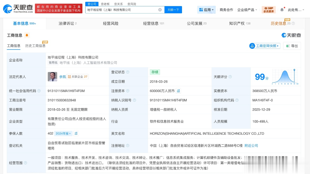 该公司成立于2018年3月,法定代表人为余凯,经营范围含信息系统集成服务、计算机软硬件及辅助设备批发、计算机软硬件及辅助设备零售、电子产品销售、货物进出口、技术进出口等。股东信息显示,该公司由北京地平线机器人技术研发有限公司全资持股。