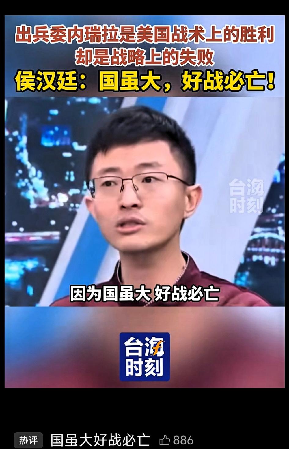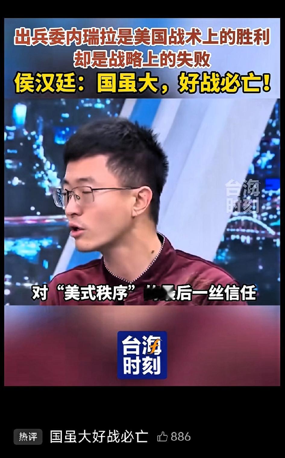 侯汉延:国虽大,好战必亡! 美国今天的胜利,是战术上的胜利,却是战略上的完败。当川普绑架了马杜罗,彻底摧毁了全球南方国家对“美式秩序”的最后一丝信任。 当一个国家的元首,可以莫名其妙被美国抓走的时候,哪还有什么外交豁免?哪还有什么主权尊严?哪还有什么国际秩序公平正义可言呢? 中国大陆此时此刻不断提倡人类命运共同体,强调二战之后的国际秩序。不搞军事同盟,不希望重回冷战时代,不输出革命,也不输出特种部队。因为国虽大,好战必亡!这必定会得到全球南方国家的支持!