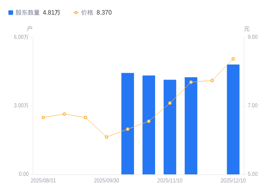 日期A股户数(户)流通A股户均持股数(股)户均持股市值(万元)2025-12-104810013147.2011.002025-11-204250014879.5411.442025-11-104140015274.8910.812025-10-274330014604.639.572025-10-104440014242.809.002025-03-314508013809.138.092025-02-204590013562.438.032025-01-104660013358.707.642024-12-314695113258.838.142024-12-104876912966.859.01