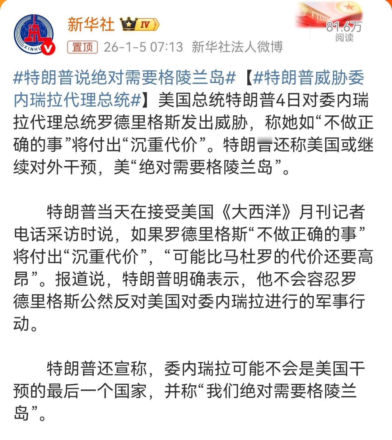 特朗普说绝对需要格陵兰岛 如果是几天前的话,特朗普如此作为有几人能信?这是把伪善面具往地上一摔,彻底不装了啊!美国这种肆意入侵他国行为,这种殖民掠夺的做法,让世人看清楚了美国所谓“基于规则的国际秩序”,实际上就是“基于美国利益的劫掠”。唇寒齿亡!世界各国需要团结抵制和应对美国的这种帝国主义行径,否则任何主权国家可能都不再安全。从特朗普宣称“委内瑞拉可能不是美国干预的最后一个国家”,并明确表示“我们绝对需要格陵兰岛” 。就可以看出他的疯狂!此前他还提出过包括“夺回”巴拿马运河、将加拿大变为“第51州”等构想,从此可以看出他的目标是不分盟友与否的,它们现在眼中只有自己的利益,而且不再顾及以前精心化妆的伪善面具!