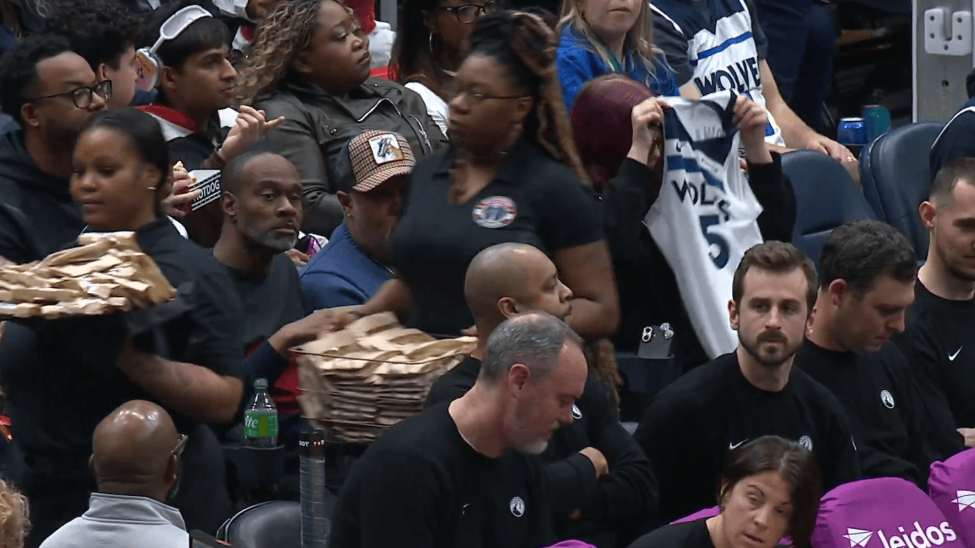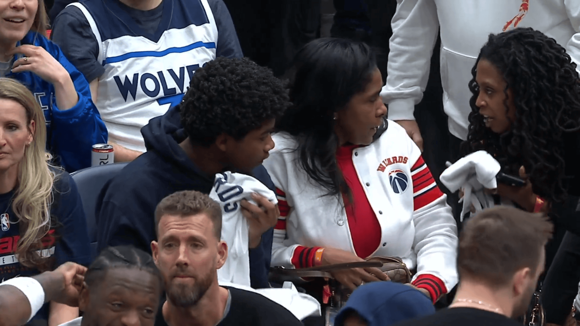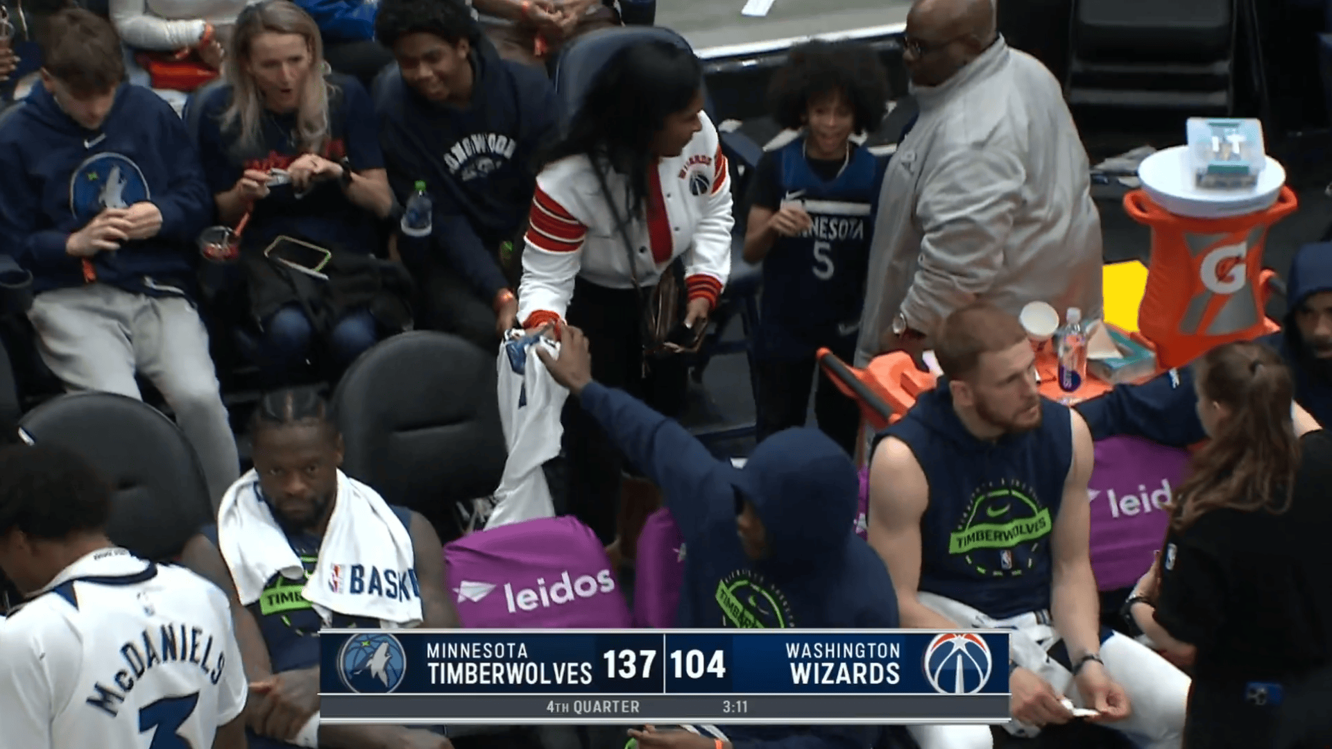 美媒赛后晒出视频:爱德华兹末节比赛中将比赛球衣脱下送给身后小球迷,但扔回去时候被一个女球迷“抢断”了,随后爱德华兹给小球迷自己身穿的球衣签上名送回给他。