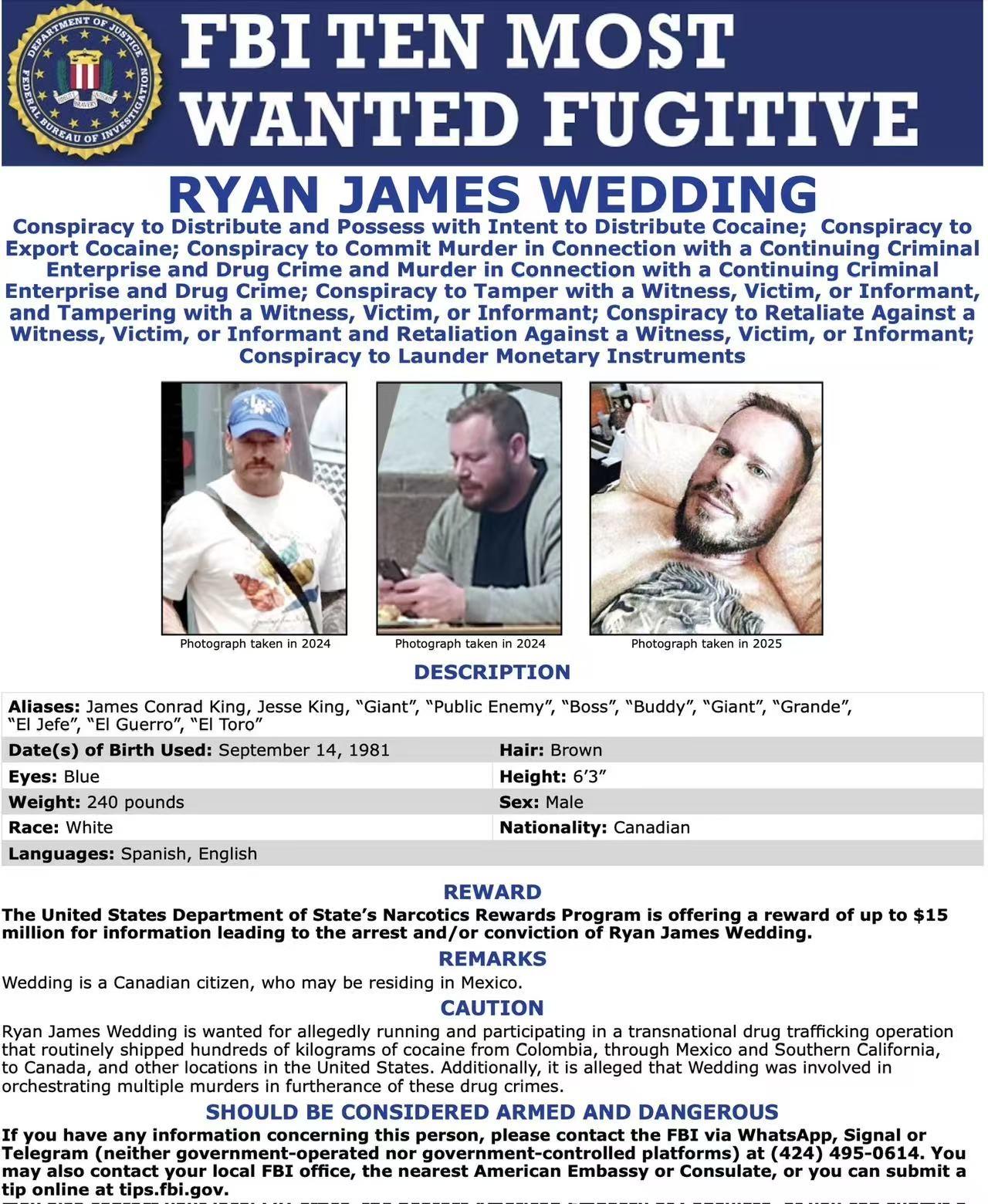 藏身墨西哥、涉嫌多起谋杀:FBI 十大通缉犯再曝惊人资产 通缉犯 Wedding 仍在逃,悬赏高达1,500万美元 【洛杉矶/墨西哥城综合报道】 美国、加拿大与墨西哥执法机构近日展开联合行动,在墨西哥执行多项搜查令,查扣大批摩托车,估计总价值高达4,000万美元。这些资产被认定属于 FBI 十大通缉犯之一 Ryan James Wedding——一名从奥运选手堕落为跨国毒枭的危险人物。 美国联邦调查局(FBI)本月20日表示,此次行动由墨西哥警方主导,并获得 FBI、加拿大皇家骑警(RCMP)及洛杉矶市警察局(LAPD)协助。执法人员在一处仓库内发现数十辆摩托车,现场画面显示规模惊人。 Wedding 曾代表加拿大参加 2002 年盐湖城冬奥会,在单板滑雪平行大回转项目中排名第24位。然而,联邦检察官指出,他后来建立并领导一个跨国毒品与暴力犯罪网络,负责将大量可卡因从哥伦比亚经墨西哥和南加州运往加拿大。 根据美国司法部披露,该组织不仅经营毒品走私,还策划并实施至少四起谋杀案,以推进其犯罪活动。毒品通常先运至洛杉矶地区的“藏毒屋”,再通过长途卡车运往加拿大。 2024 年 10 月,Wedding 与另外 15 人被正式起诉。执法部门称,他使用多个化名,包括 “El Jefe”、“Public Enemy”、“Giant” 和 “Jesse Conrad King” 等。案件曝光后,他被列入 FBI 十大通缉犯名单。 尽管上个月已有 10 名与其犯罪集团有关的人员被捕,涉及一起联邦证人遇害案,但 Wedding 本人至今仍成功潜逃。 FBI 表示,现年 43 岁的 Wedding 为加拿大公民,身高约 6 英尺 3 英寸(约 191 公分),体重约 240 磅,蓝眼睛、棕色头发,目前被认为藏身墨西哥,应被视为持械且高度危险。 FBI 悬赏最高 1,500 万美元,征集任何可促成其逮捕或定罪的有效线索。 📱 线索提交方式 知情人士可通过 WhatsApp、Signal 或 Telegram 联系 FBI: 📞 424-495-0614 也可联系当地 FBI 办公室、最近的美国使领馆,或通过以下网址匿名提交线索: 👉 更多信息请访问: 👉 -james-wedding