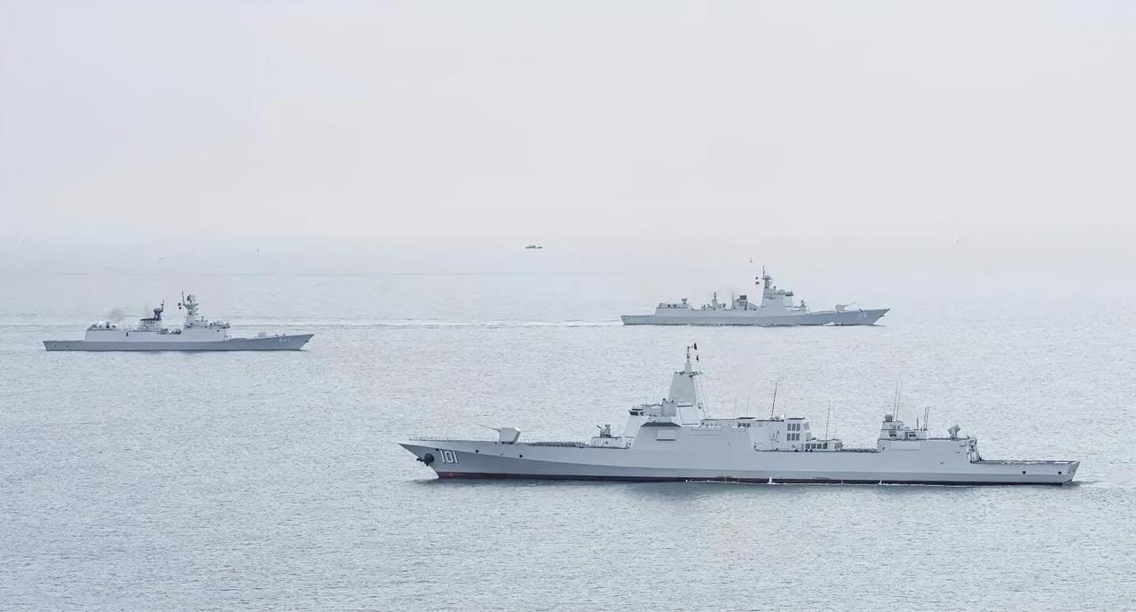 航母编队的三大保镖舰艇同框了,他们分别是 055型101号南昌舰、 052D型1