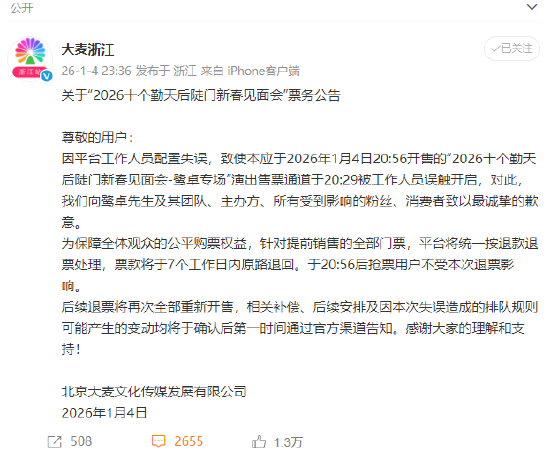 公告表示,因平台工作人员配置失误,致使本应于2026年1月4日20:56开售的“2026十个勤天后陡门新春见面会-鹭卓专场”演出售票通道于20:29被工作人员误触开启。
