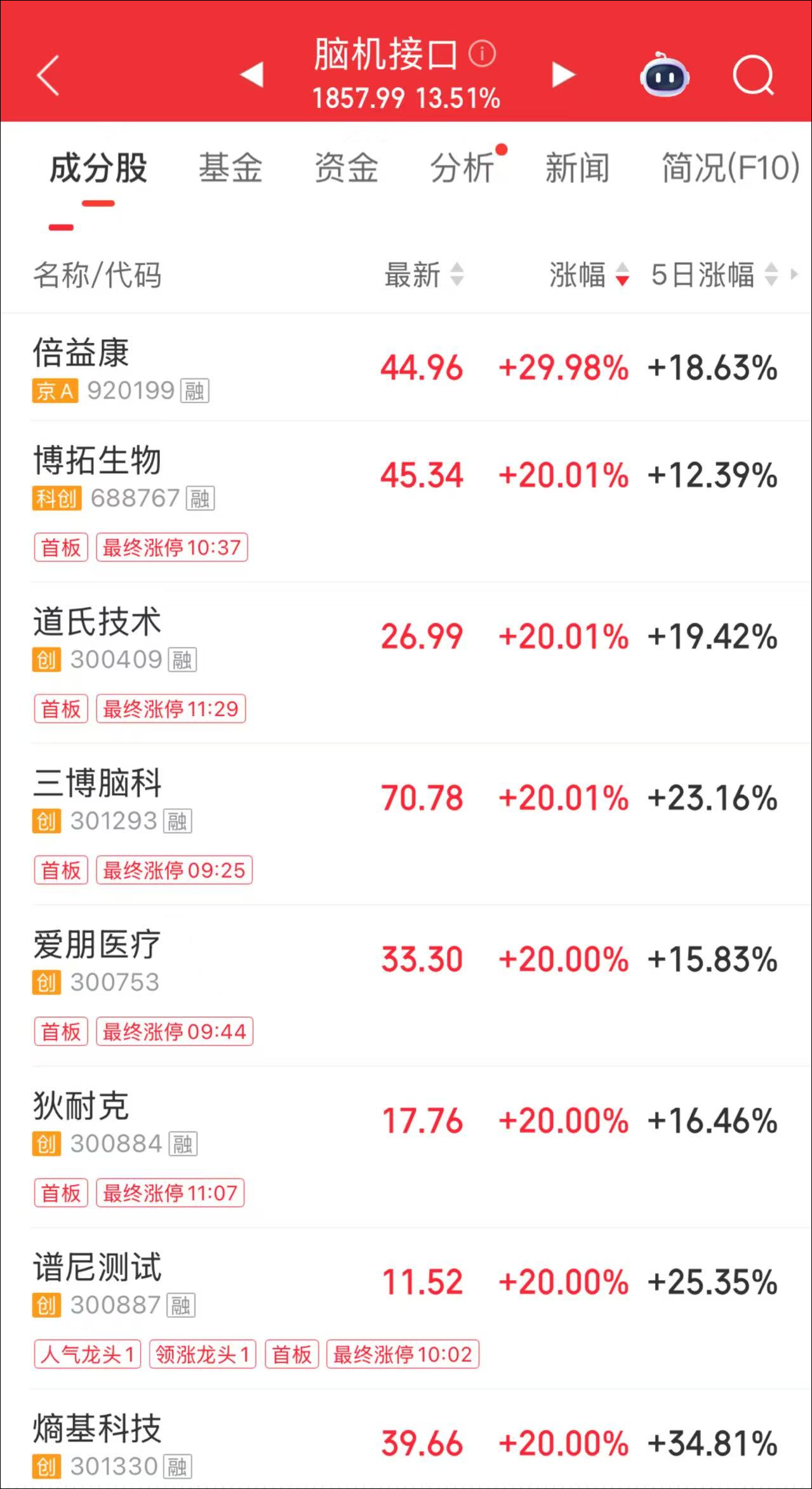 其中,科技方向的脑机接口成为两市“最靓的仔”,盘中,倍益康30CM涨停,三博脑科、翔宇医疗、美好医疗、爱朋医疗、诚益通、伟思医疗20cm涨停,创新医疗、南京熊猫10CM涨停,博拓生物、狄耐克等涨超10%,在2026年首个交易日大有超越AI引领科技新主线的味道。