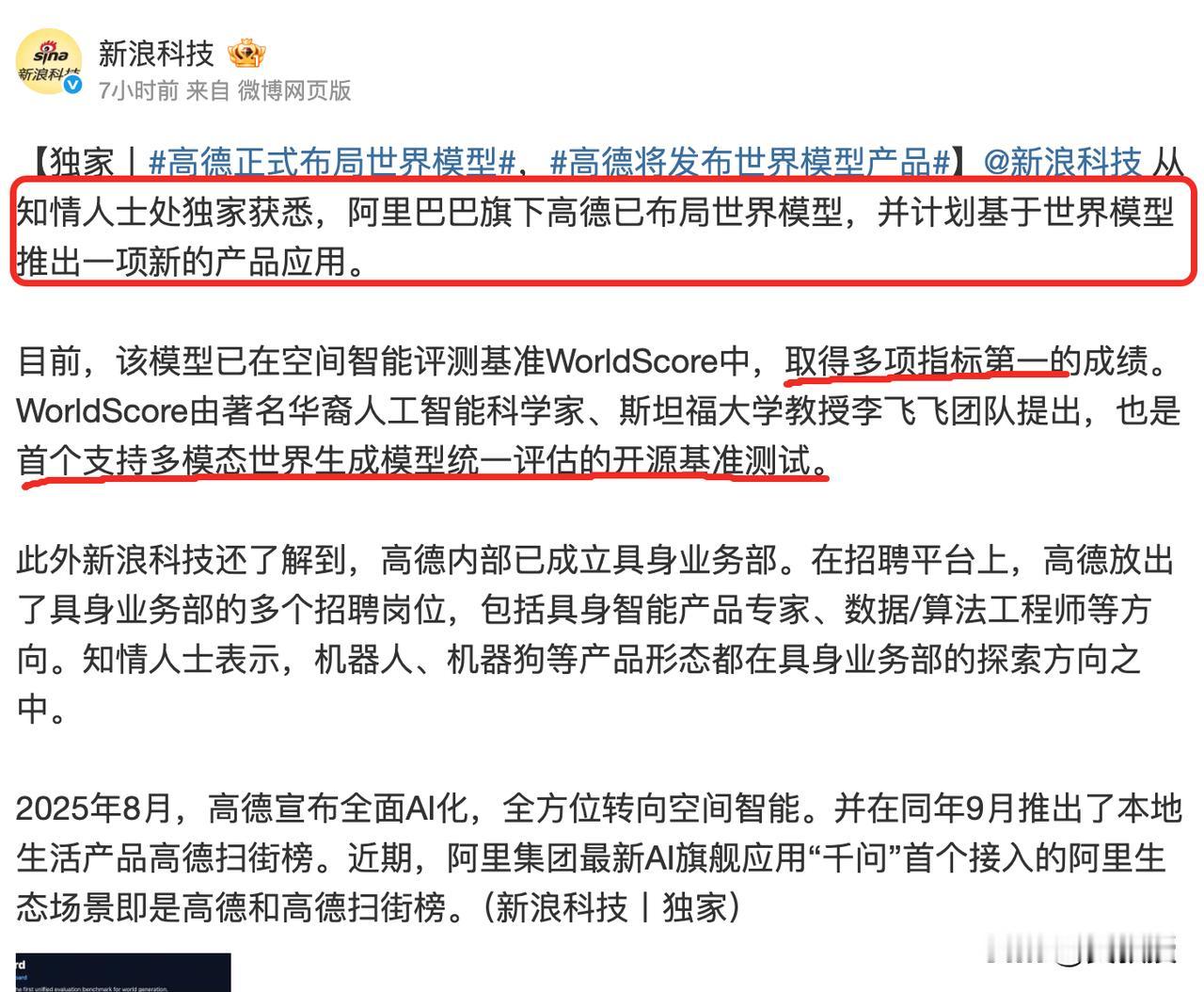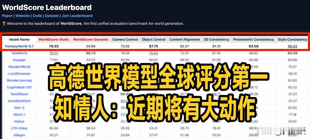 高德扫街榜又有大动作?释放的信号不同寻常! 看到一个新闻,阿里旗下高德已经布局世界模型,还将要基于此推出一个新的产品应用。 世界模型是什么?咱普通人看新闻可能理解不了,不过专业机构,对于这个世界模型的实力是非常认可的。 新闻上说,阿里的世界模型已经在评测中拿下了多项指标第一的成绩。坦福大学教授李飞飞团队也提出,这是首个支持多模态世界生成模型统一评估的开源基准测试。 高德从2025下半年到2026年开年动作不断,很多人可能感觉不可思议,实际上一切都是水到渠成的事儿。 要知道,高德在2025年的时候,宣布全面AI化,并且基于真实行为推出了高德扫街榜。 另外,前段时间,有一些做自媒体的朋友,这两天收到了高德发布会的邀请函。算了下时间,距离扫街榜发布三个多月,预感近期会有大动作。 按照这个趋势来看的话,在2026年世界模型份量虽然很重,但极有可能是高德扫街榜在新年的开胃菜,后面高德扫街榜估计还会加大力度,带给咱普通人更好的体验。