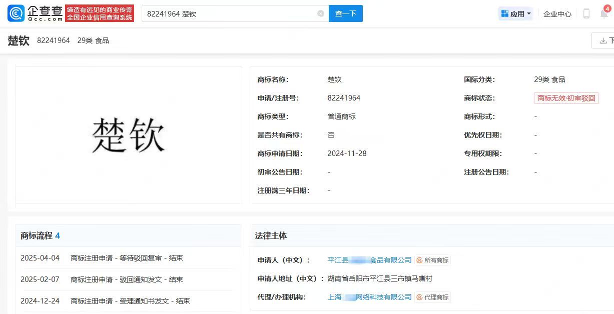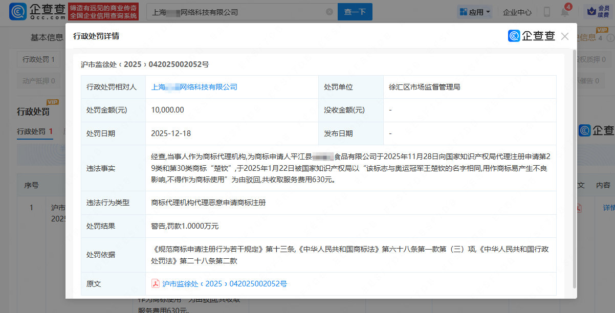 [#代理机构抢注楚钦商标被罚#]#机构抢注王楚钦名字商标被罚#企查查APP显示,近日,一商标代理机构因代理恶意申请商标注册行为被警告,并被罚款10000元。违法事实显示,该公司作为商标代理机构,为商标申请人代理注册申请第29类和第30类商标“楚钦”,于2025年1月22日被国家知识产权局以“该标志与奥运冠军王楚钦的名字相同,用作商标易产生不良影响,不得作为商标使用”为由驳回,共收取服务费用630元。