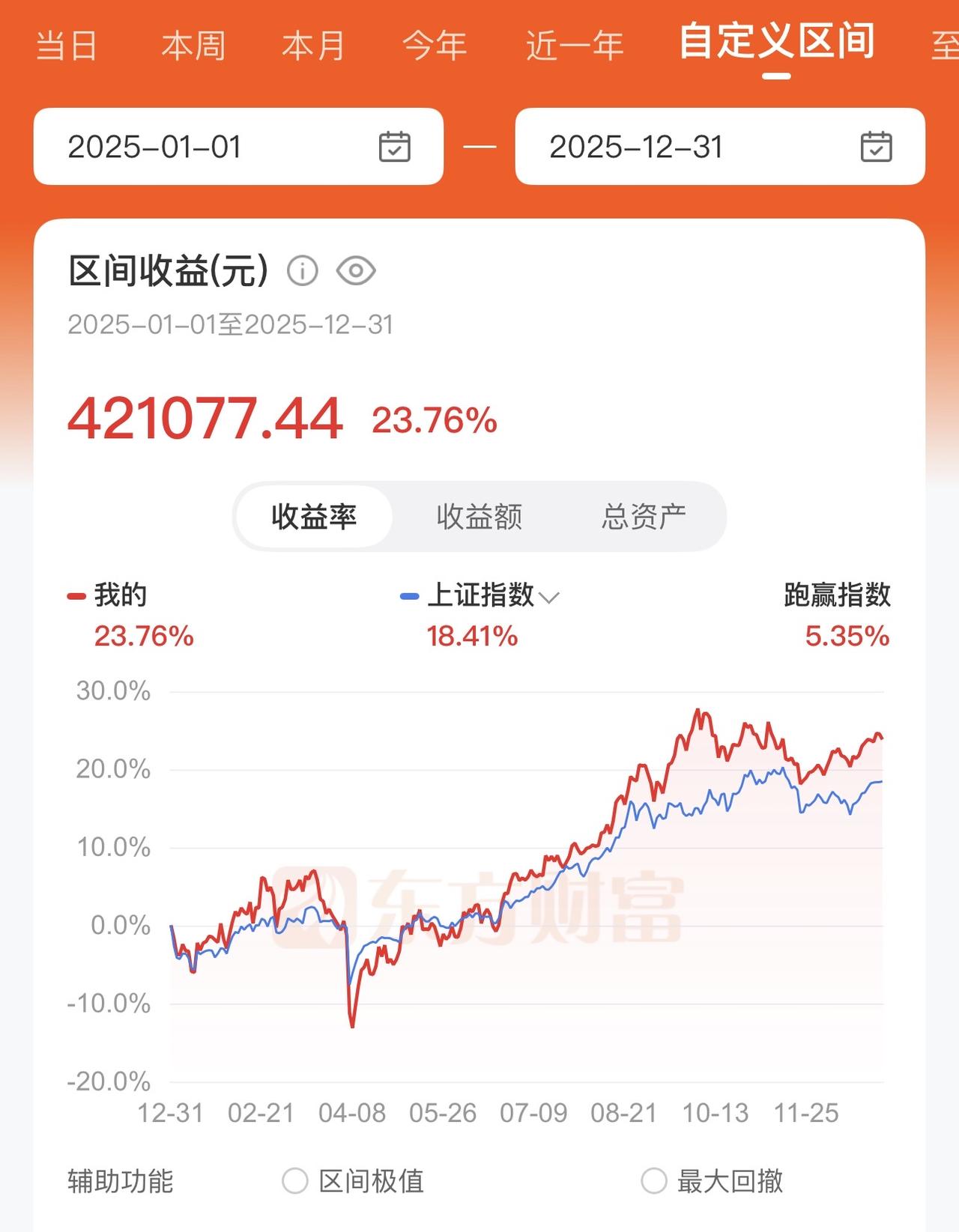今天新年股市第一天,开门红。 可惜年前最后一天没敢加仓,去年开年大跌跌怕了。 看了看去年的账户盈利情况,盈利42万,没有达到预期的五十万盈利。跑赢大盘一点。身边的很多朋友都发财了,自己水平还是不行。尤其年底轻仓错过几次大涨机会。 今年很多人股市目标都是翻倍,我是不敢想,全年能盈利10%就不错了,目标20万,挣钱继续旅行。