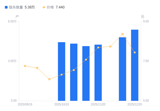 日期A股户数(户)流通A股户均持股数(股)户均持股市值(万元)2025-12-205390011732.478.732025-12-104810013147.2011.002025-11-204250014879.5411.442025-11-104140015274.8910.812025-10-274330014604.639.572025-10-104440014242.809.002025-03-314508013809.138.092025-02-204590013562.438.032025-01-104660013358.707.642024-12-314695113258.838.14