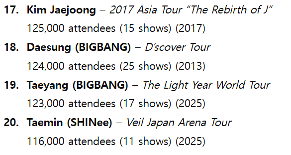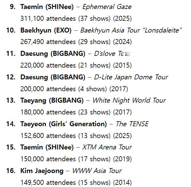 【Theqoo】历代韩国流行偶像个人巡演动员观众Top20: