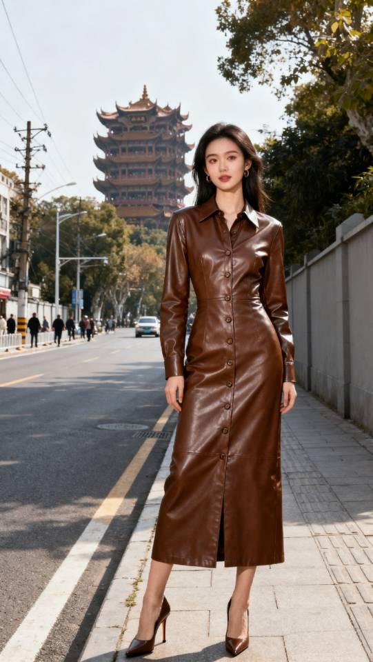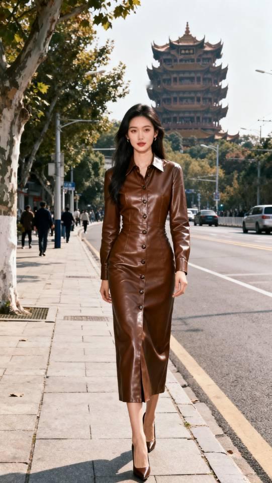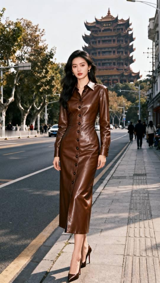 棕色皮连衣裙女子景点打卡留影。皮连衣裙 皮裙