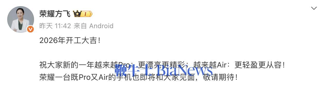 据悉,1月4日,荣耀预热了一款“既Pro又Air”的新机,据爆料该机型为荣耀Magic8Air,将搭载天玑9500旗舰芯片,机身厚度控制在5-6mm区间,同时内置超5000mAh大电池。