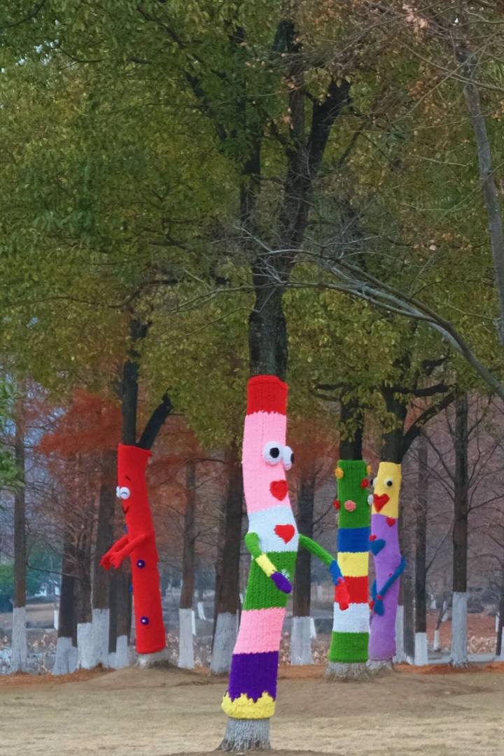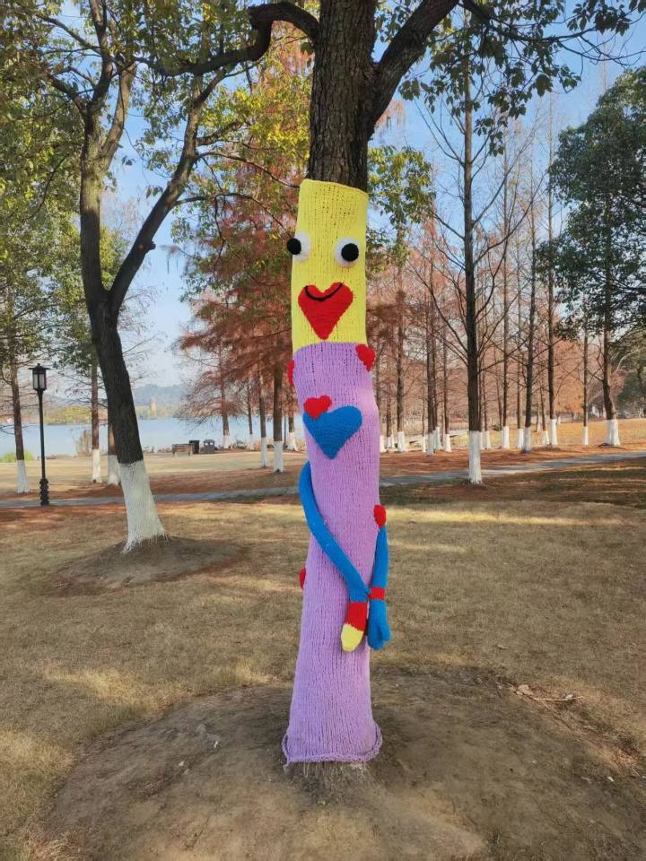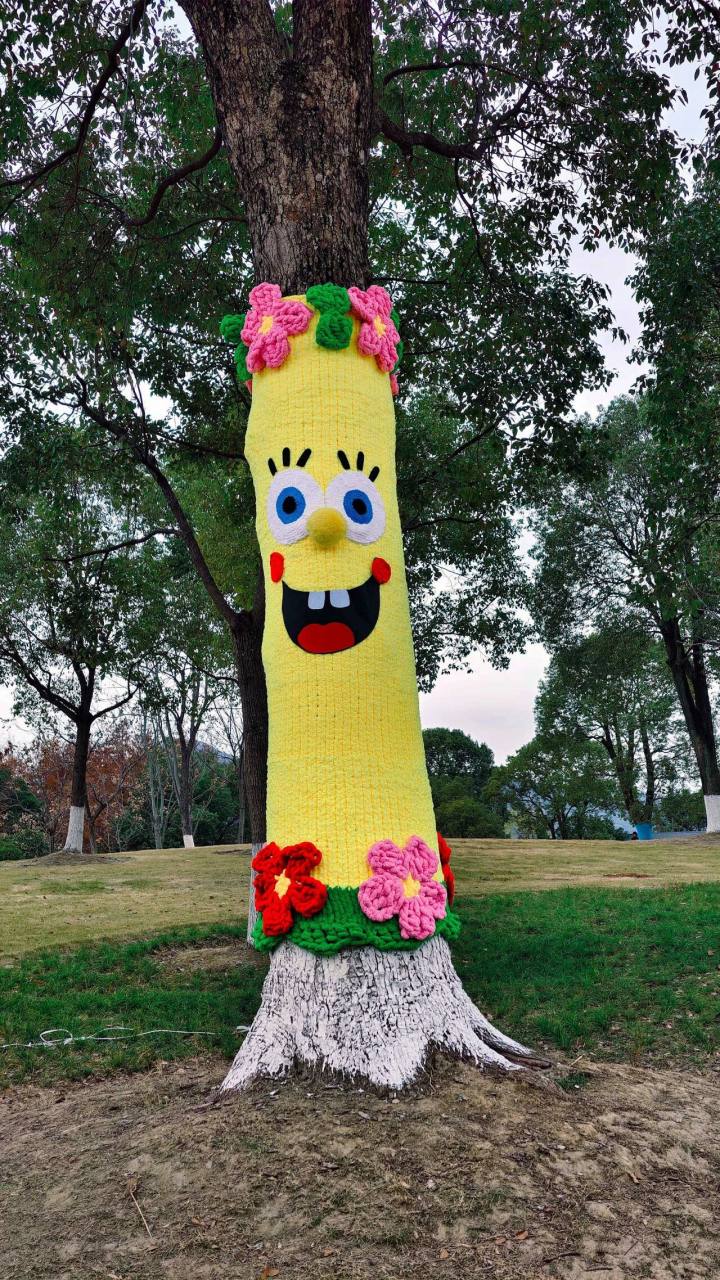 湖山广场西侧的翦波桥附近,每一件“毛衣”都独一无二,造型各异、巧思满满。海绵宝宝的笑脸在树干上绽放,背着小挎包的大树仿佛在准备出游,还有戴着手套、各式表情的创意设计,卡通、撞色、拟人化等多样图案交织。