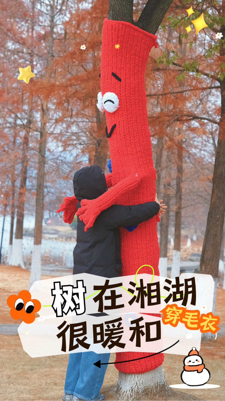 最近,杭州大降温,大家都穿上了厚厚的冬装。湘湖为大树们穿上了“多巴胺”毛衣,这些平日里沉默的“绿色巨人”,变得鲜活可爱。