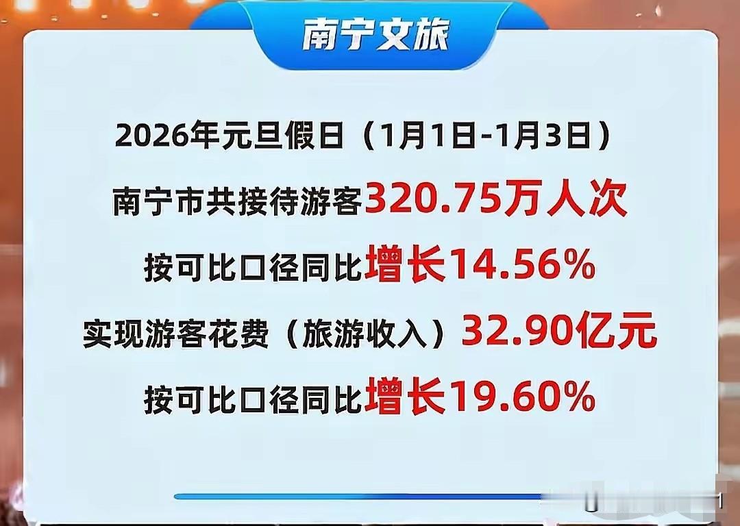 又到了节假日盘点成绩单的时候啦!26年元旦假期(1至3日)广西旅游成绩前四名的南宁、桂林、北海与柳州表现如何? 南宁:320.75万人次,同比增长14.56%,旅游收入32.90亿元,同比增长19.60%。 北海:99.32万人次,同比增长40.89%,旅游收入9.08亿元,同比增长41.42%。 这次桂林羞羞答答的截至5号仍未见有成绩公布,未见有“应战”,成绩大概率是平平吧。 至于柳州,依旧保持惯例,不凑热闹不主动公布旅游成绩单。 综上所述,北海旅游交出了一份亮眼的成绩单,南宁表现不俗,依然是头牌!