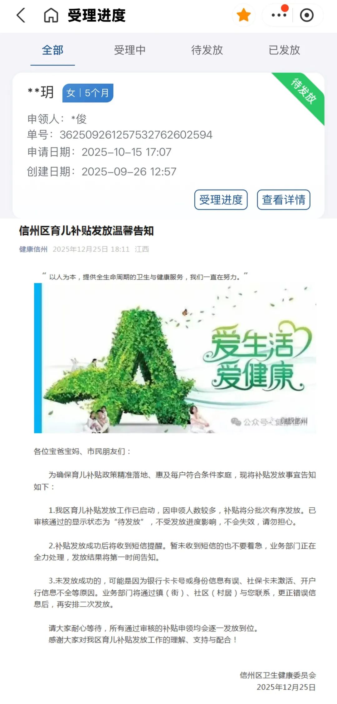 信州区卫生健康委员会回复:信州区育儿补贴发放工作已启动,因申领人数较多,补贴将分批次有序发放。已审核通过的显示状态为“待发放”,不受发放进度影响,不会失效,不会过期,请勿担心。审核通过的会逐一发放到位,请耐心等待。