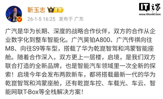 与此同时,华为智能汽车解决方案BUCEO靳玉志也发文称:“启境,是我们双方联合打造的全新品牌,也是智能汽车领域里一次全新的探索!启境今年会发布两款新车,都将搭载最新一代的华为乾崑智驾和鸿蒙座舱,还有乾崑车控、车载光、车云、智能网联T-Box等全栈解决方案。”