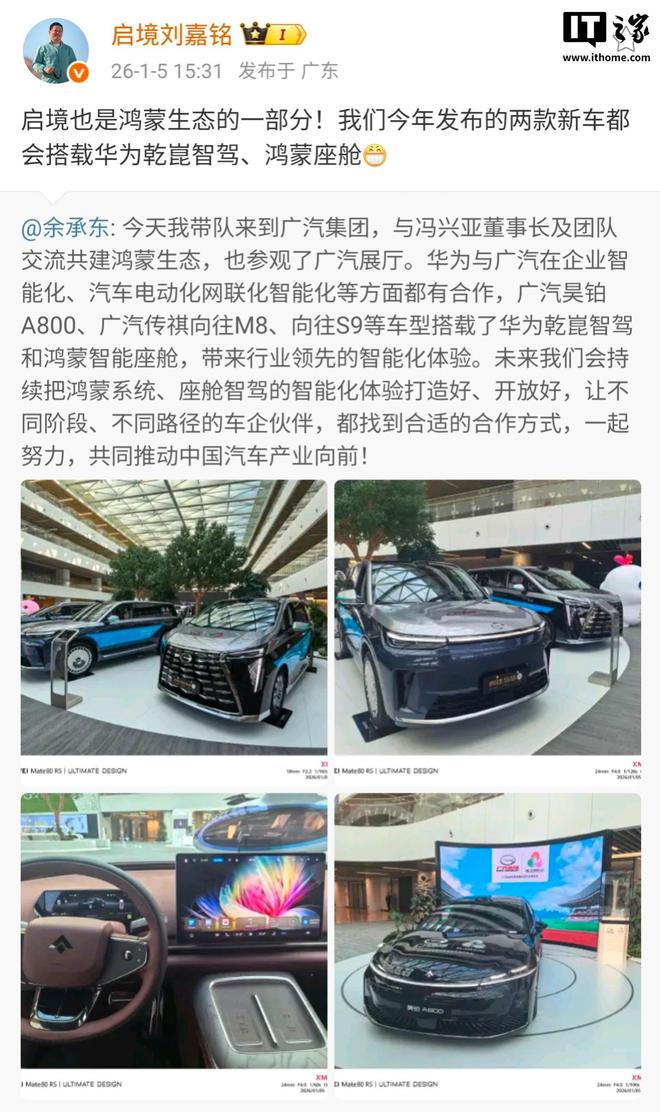 IT之家1月5日消息,华为常务董事、产品投资评审委员会主任、终端BG董事长余承东今日发文称,自己今天带队来到广汽集团,与冯兴亚董事长及团队交流共建鸿蒙生态,并参观了广汽展厅。