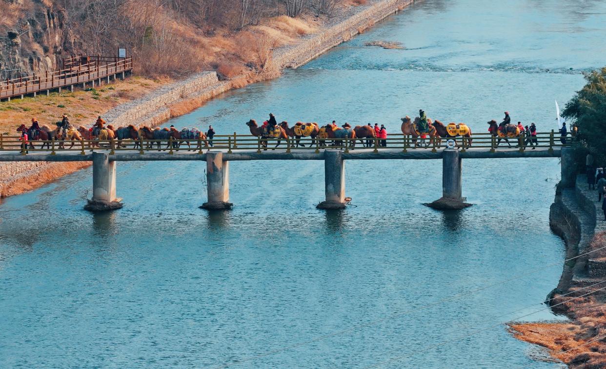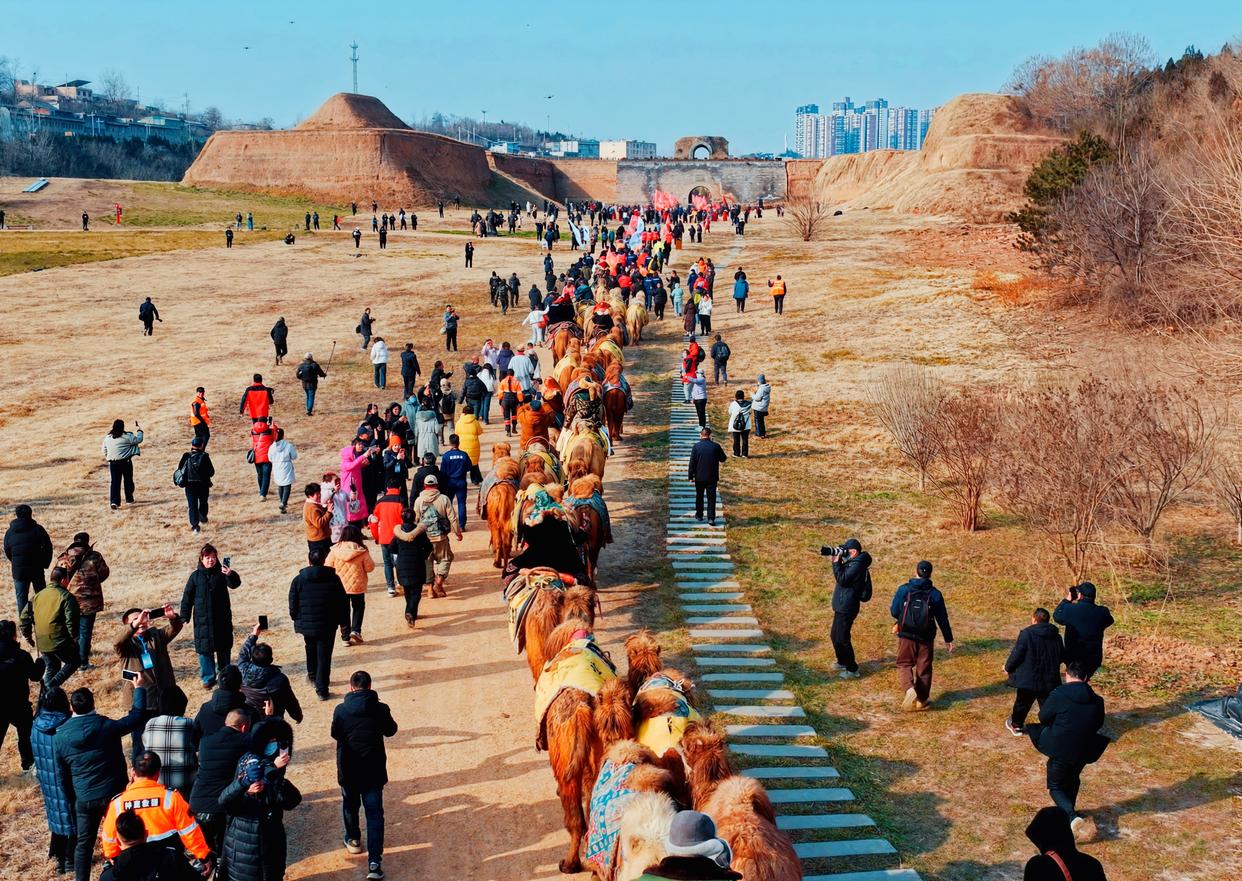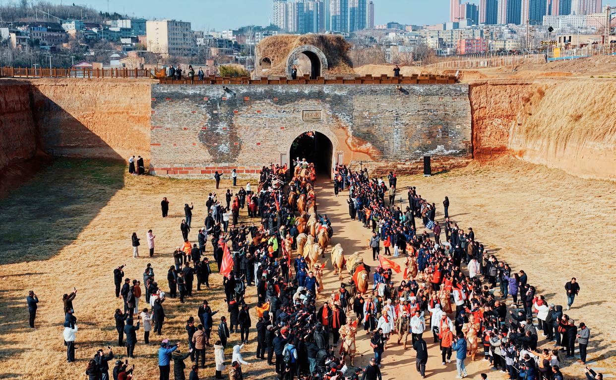 2026年1月5日,小寒。一支来自东天山的驼队缓缓行至洛阳汉函谷关城门前。马蹄声与驼铃声交织,在丝路古道上扬起阵阵黄沙。驼队成员身着传统民族服饰,与安静的骆驼一同在关前肃立等候。