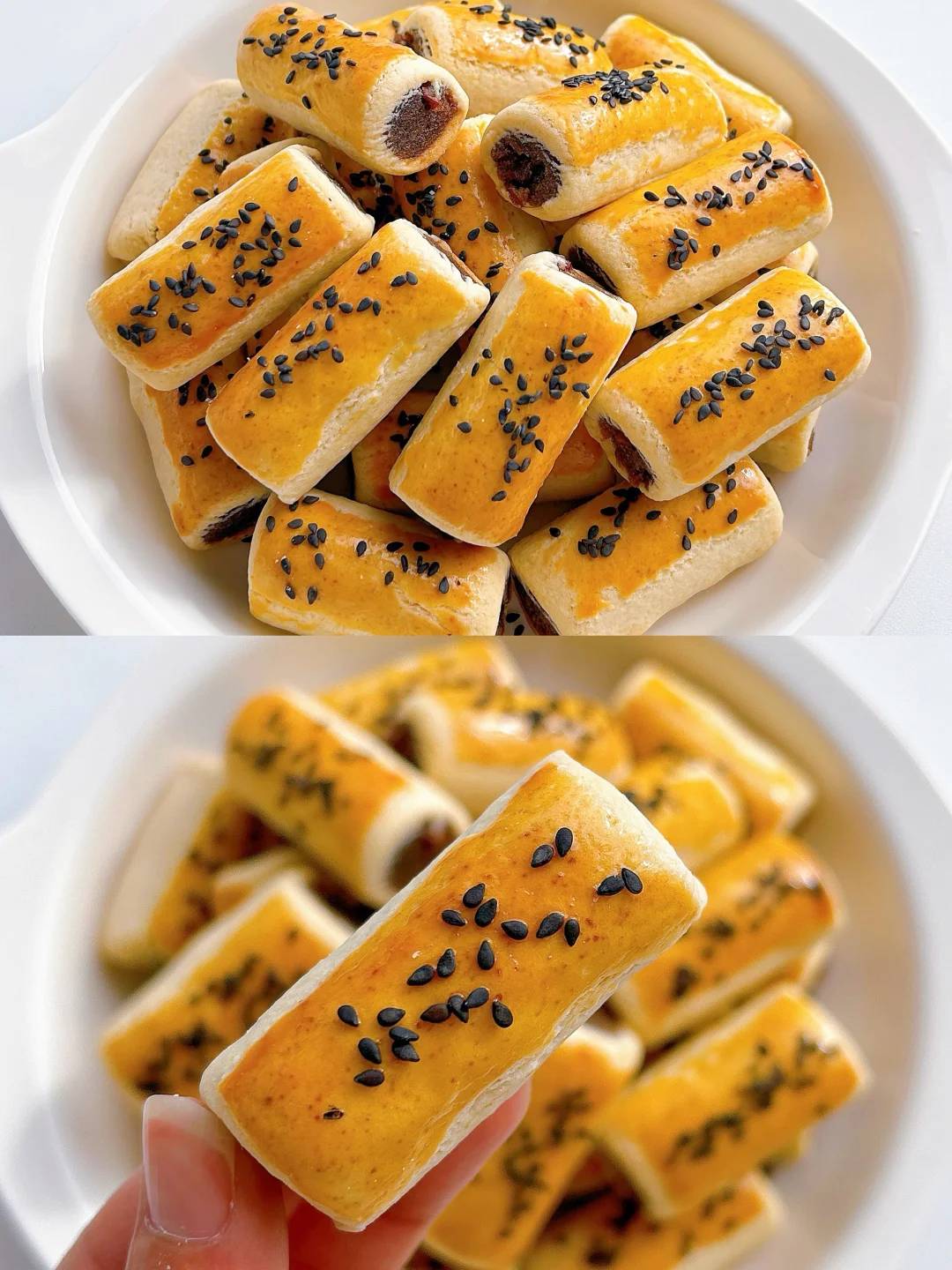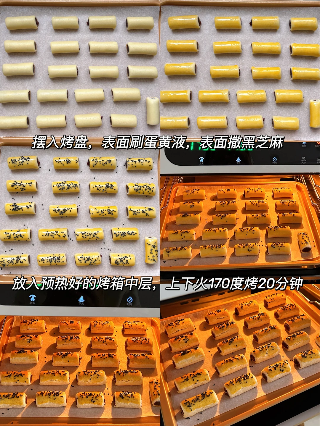 5️⃣、包保鲜膜放入冰箱冷冻10分钟定型,然后切成5cm的小段,摆入烤盘,表面刷上蛋黄液,撒黑芝麻