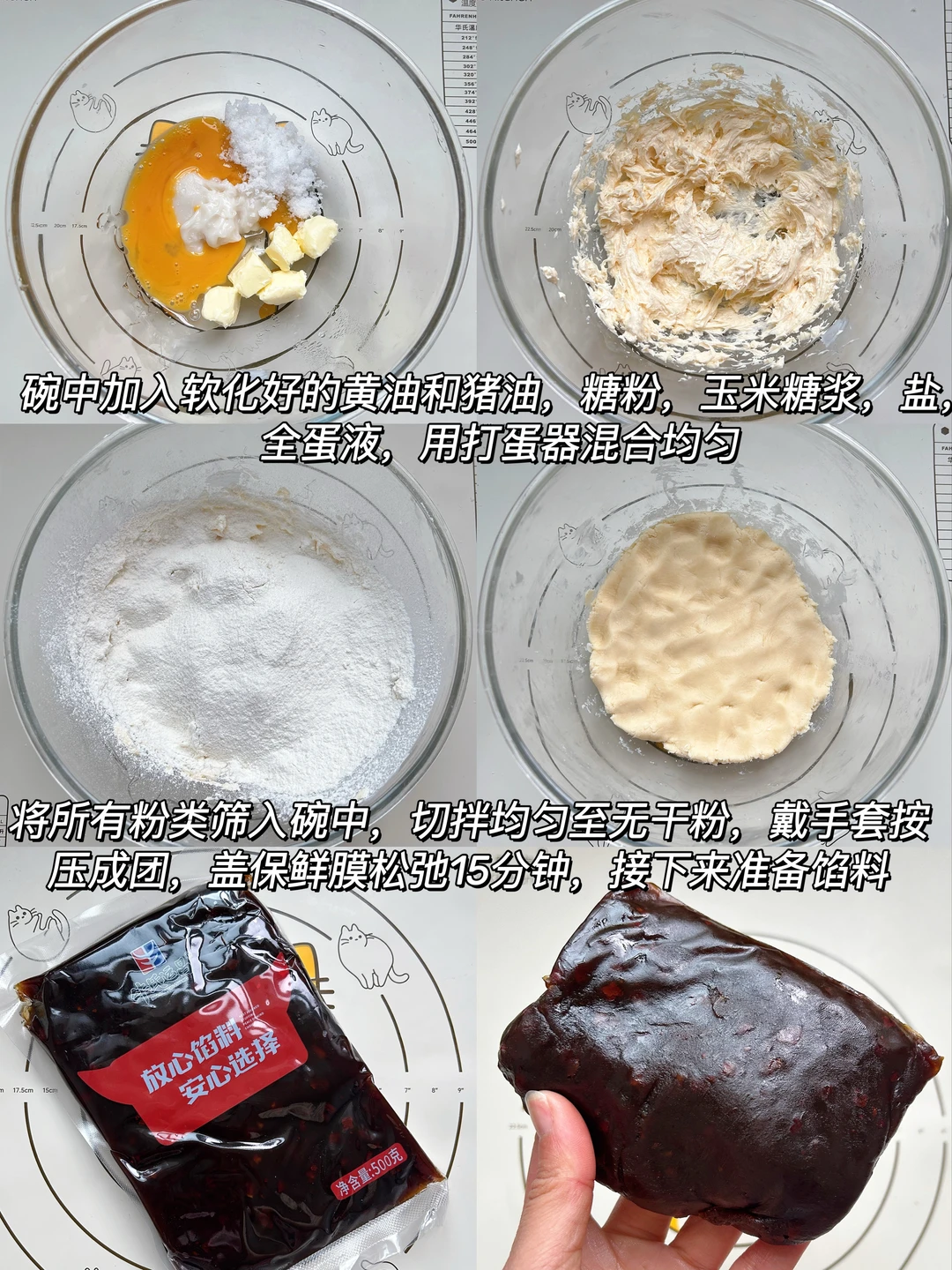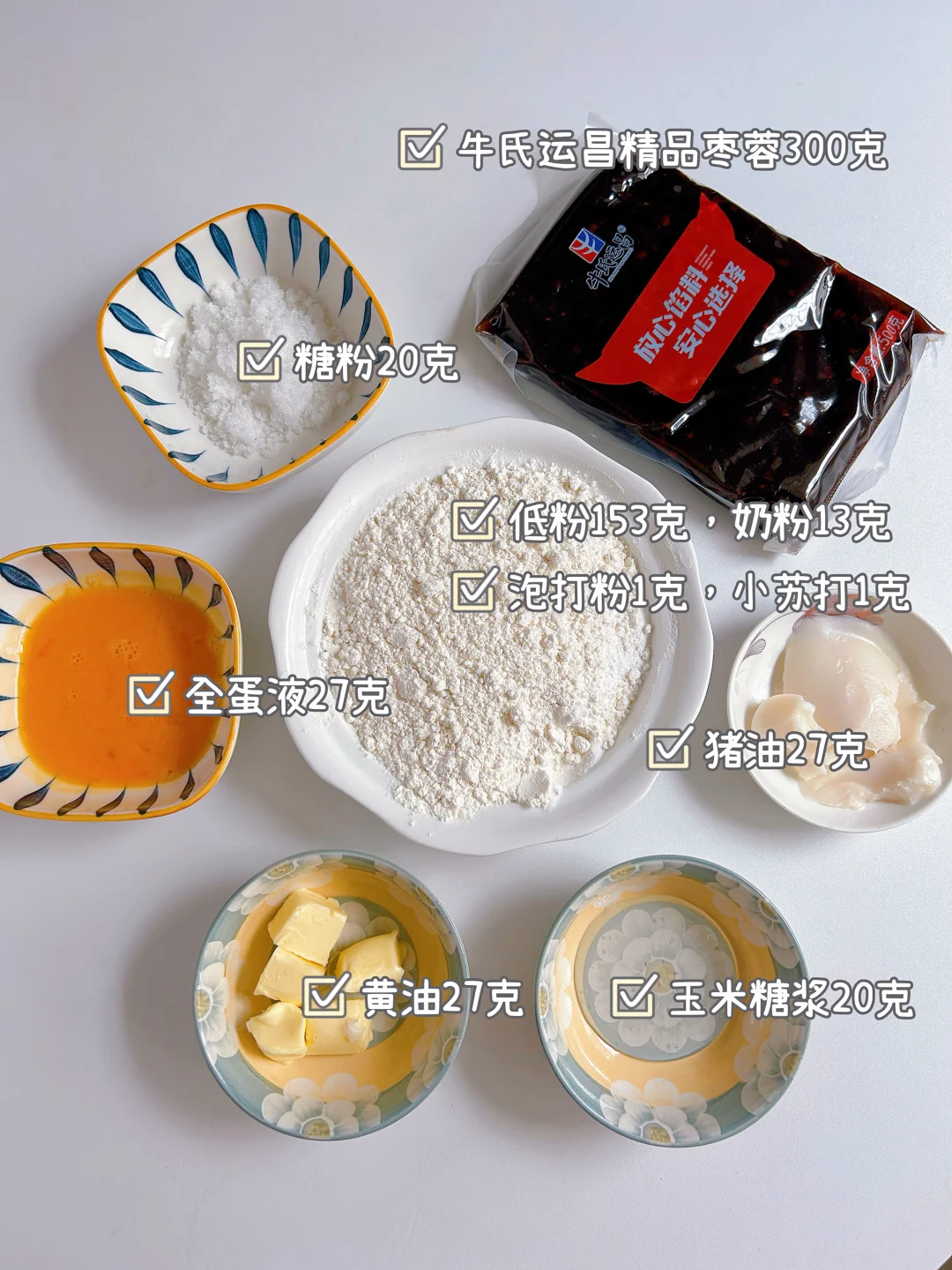 黄油27克g,糖粉20g,盐1g,常温鸡蛋液27g,猪油27g,低筋面粉153g,奶粉13g,玉米糖浆20g,无铝泡打粉1g,小苏打1g,牛氏运昌精品枣蓉馅300g,刷面蛋黄一个,黑芝麻适量