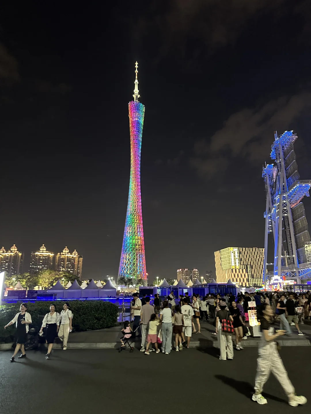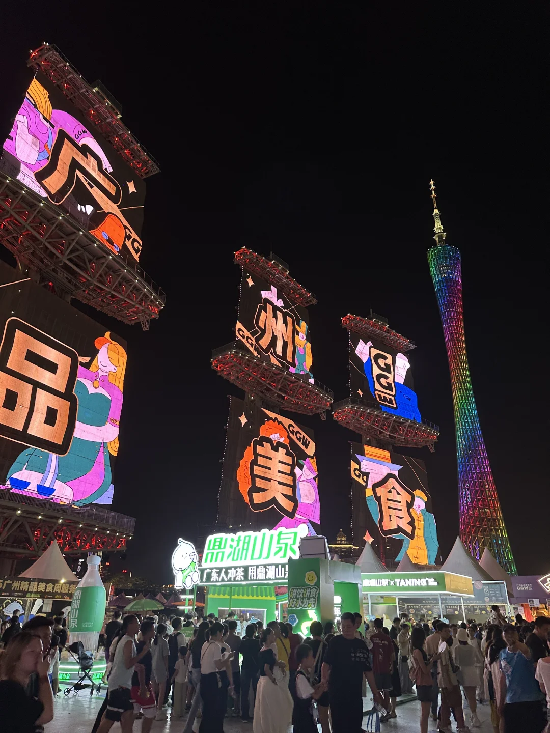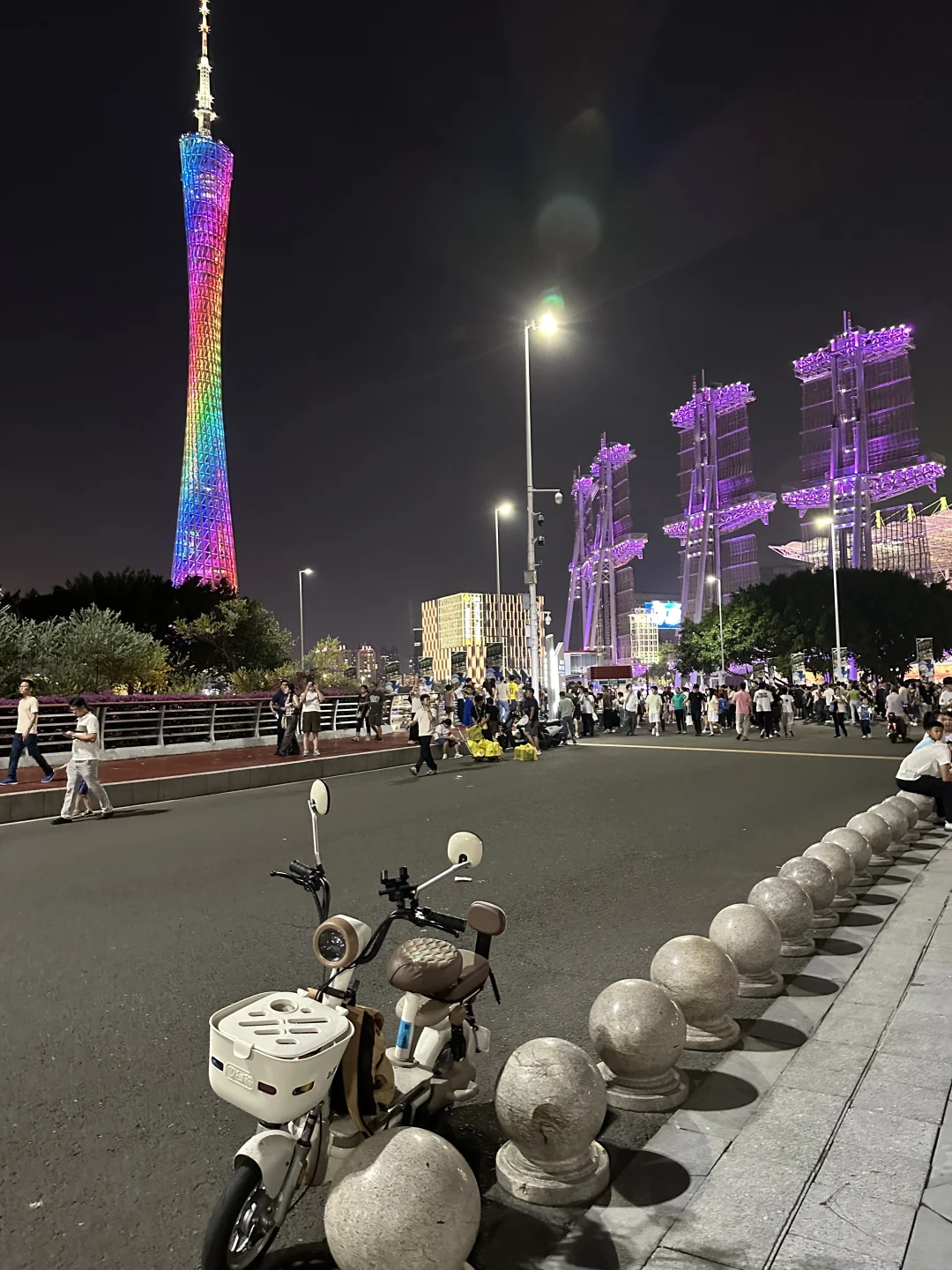 晚上直接撞上海心沙美食节!🍢 各种小吃摊香气扑鼻,烤串、奶茶、甜品应有尽有,边逛边吃边拍照,幸福感直接爆棚。吃饱喝足,必须再给我的小电动安排一组夜景合影!和广州塔同框、和东西塔贴贴,灯光璀璨的背景板,怎么拍都好看~