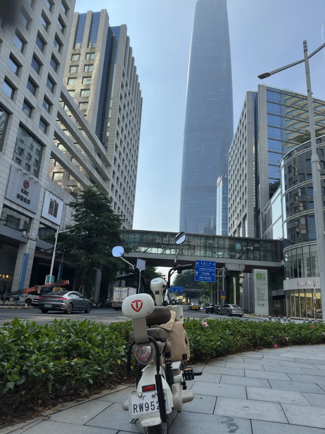 一大早骑小电动直奔珠江新城!🚲 第一件事就是给我的“老伙计”和广州国际金融中心西塔拍合影!蓝天为背景,高楼当陪衬,小电动往镜头前一摆,瞬间拍出都市骑行的酷飒感,朋友圈直接被问链接~