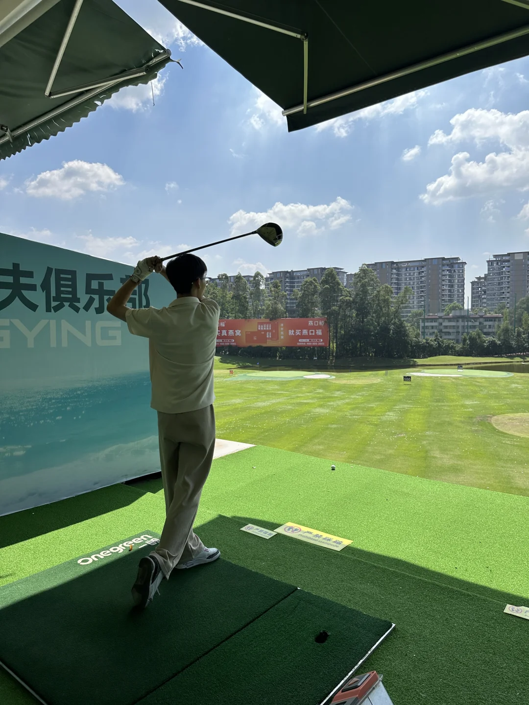 接着冲五山高尔夫球场!⛳️ 不愧是富人区附近的宝藏场地,满眼的翠绿草坪,空气清新到不像话。天气好到爆炸,挥杆的瞬间风都跟着温柔,小白也能玩得超开心,在草坪上奔跑、摆拍,每一张都是阳光活力大片,连教练都夸我拍照姿势比挥杆标准~