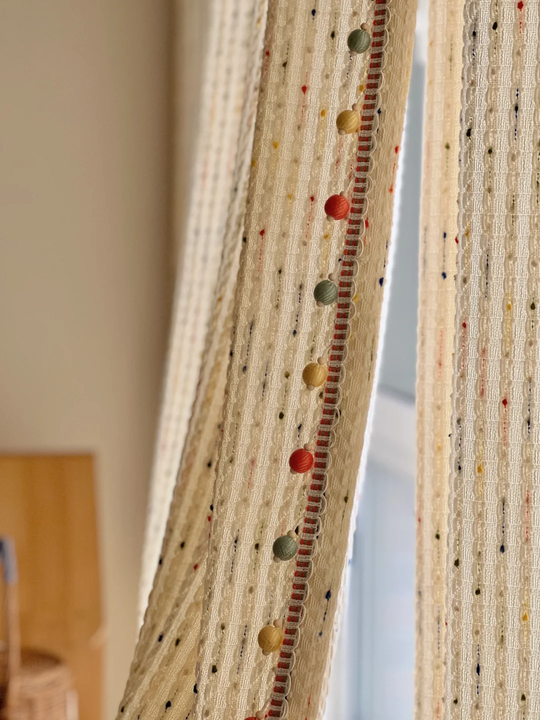 窗帘一挂,房间立马变童话! 强烈推荐这款纹理感超强的厚实窗帘,不仅遮光效果好,设计更是非常用心,布满了治愈系的彩色小点点,像藏在云朵里的糖果🍬 边缘还镶嵌了一条多巴胺小圆球,童趣满满,孩子很喜欢💕