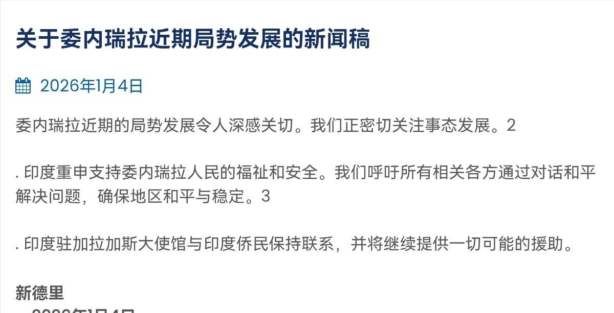 莫迪也出来说话了!1月4日,印度发表外交说明表示,委内瑞拉近期的局势发展令人深感关切。我们正密切关注事态发展。印度重申支持委内瑞拉人民的福祉和安全。我们呼吁所有相关各方通过对话和平解决问题,确保地区和平与稳定。印度驻加拉加斯大使馆与印度侨民保持联系,并将继续提供一切可能的援助。 1月3日凌晨,美军发动“绝对决心”军事行动,突袭加拉加斯并强行控制总统马杜罗夫妇,经关塔那摩基地转运至纽约,美方安排马杜罗于美国东部时间5日中午出庭,被控“毒品恐怖主义阴谋罪”。这场突发行动让委内瑞拉局势瞬间失控,也震动了整个拉美地区。 局势爆发后,委内瑞拉国内反应迅速且强硬。马杜罗之子、国会议员尼古拉斯·马杜罗·格拉发布录音号召支持者抗议,并回应“内鬼”传言。 最高法院随即下令副总统罗德里格斯出任代理总统,罗德里格斯在国家电视台明确表态,马杜罗是“唯一合法总统”,委内瑞拉绝不沦为殖民地。 国防部长洛佩斯直接宣布启动全面战备,誓言以一切力量对抗侵略、维护秩序。密集的回应让地区紧张感拉满,周边国家也纷纷陷入不安。 看清这一背景,就知道印度的表态绝非外交客套,而是基于利益与战略的精准发声。从双边关系看,印委建交已超60年,驻外使馆运作数十年,存在扎实的利益绑定。 委内瑞拉从印度大量进口大米、药品等民生必需品,印度制药企业也长期深耕当地市场。如今局势动荡,既威胁印度在委商业利益,也波及驻加拉加斯印度侨民安全,这正是印度强调“保障侨民、提供援助”的核心动因。 这是印度深耕拉美战略的延续。2025年是印度“拉美外交年”,莫迪亲自带队访问阿根廷、巴西等国,这是印度总理57年来首次单独访阿,期间通过金砖、G20等多边框架,深化能源、关键矿产、国防等领域合作。 截至2025年中,印拉贸易额已突破450亿美元,既拓宽了印度的资源进口渠道,也为本土产业打开出口市场,契合“自力更生印度”愿景。 委内瑞拉作为拉美重要国家,是这一战略的关键一环,印度此时发声,既是维护地区稳定的考量,也是向拉美传递“可靠伙伴”信号,巩固自身影响力。 印度的立场与国际社会主流声音高度呼应。美军行动已遭到全球广泛谴责:中、俄明确反对,强调尊重主权与国际法;哥伦比亚、巴西等六国联合声明,指出美方行径违反《联合国宪章》,开创危险先例;美国国内也有大量议员、民众质疑特朗普政府行动的合法性。 联合国安理会已敲定5日召开紧急会议,与马杜罗庭审同日同地举行,让局势走向充满变数。印度呼吁“对话解决”,实则站在反对强权政治的阵营,契合其“全球南方”代表的定位,也能进一步提升国际话语权。 不少人会问,印度的表态能改变局势吗?客观而言,单靠一份外交声明难以直接扭转态势,但价值不容忽视:一方面为国际社会介入提供舆论支撑,进一步孤立美方;另一方面为印度拉美战略添注筹码,夯实与包括委内瑞拉在内的地区国家合作基础。 当前,委内瑞拉军方已进入战备,代理总统寻求与美构建“平衡关系”,国际谴责声浪持续,安理会紧急会议成为关键节点。局势最终能否和平解决,既取决于美委博弈,也离不开国际力量的斡旋推动。 莫迪就委内瑞拉局势发声,是利益考量与战略布局的双重体现:既守护在委商业利益与侨民安全,也推进深耕拉美的外交议程,同时顺应国际社会反对强权的主流呼声。 接下来,纽约的安理会会议与马杜罗庭审将是核心看点,这场牵动全球神经的地区动荡最终走向如何,值得持续关注。